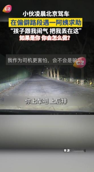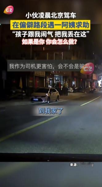 “离了个大谱!”2025年10月,北京,一男子凌晨驾车行驶在偏僻路段,突然看到一名阿姨双手挥舞小跑着求助,称孩子置气把她丢在了这里,男子让阿姨坐上了后排,将其送到了家,网友:不管怎样都不能将老人都在荒郊野岭! 有些孩子跟父母简直就是“冤家”,脾气一上来什么都能做得出来,哪怕是将父母大晚上丢在一个黑灯瞎火的陌生环境里,丝毫不考虑父母的生命安全。 一男子凌晨开车在一处偏僻小路上,四周漆黑一片十分寂静,忽然,男子发现车辆前方出现了一个人影,一个穿着黑白格子外套的阿姨不断挥手求助,朝男子车辆位置小跑过来。 荒郊野岭突然窜出个人,这太反常理了,男子有些害怕但还是将车停了下来,阿姨称孩子和自己置气,把她一个人丢在了这里,自己骑电动车回家了,她请求男子将她带到有灯的地方。 男子听后也没多想,让阿姨坐到了车子后排,在询问过阿姨的家庭住址后,一脚油门将她送回了家,阿姨不断感谢男子。 不少网友表示男子的做法还是有风险的,遇到这种情况最好还是帮忙报警,阿姨的孩子也是狠心,竟然把自己的老娘丢到深山老林里,不管发生什么,不要因为和父母一时置气,就把其置于险境! 信息来源:《你会帮忙吗?小伙凌晨在北京驾车,遇到一阿姨求助:“孩子跟我置气,骑车把我丢在这。》广州广播电视台