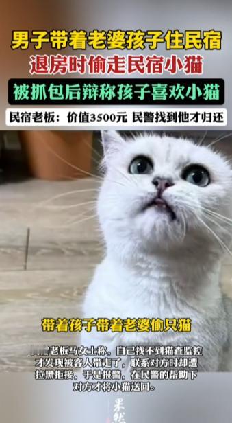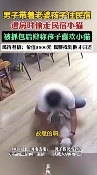“太缺德了!”10月5日,河南洛阳,一男子带着老婆孩子住民宿,退房时“顺手牵羊”将民宿老板价值3500元的宠物猫偷走,老板给男子打电话被他拉黑,民警找上门男子辩解称孩子喜欢小猫才拿走,网友:孩子要是喜欢星星,他就得上天? 有些人对孩子溺爱到了一定地步,恨不得把自己的心掏出来给孩子看,可溺爱归溺爱,毕竟是人家自己的家事,别人也管不着,但是为了满足孩子的要求家长去偷别人的东西,那可就说不过去了。 一男子带着老婆孩子出门旅游时,入住了一家民宿,民宿老板养了一只宠物猫,男子的孩子看起来挺喜欢小猫,一直在逗弄它,男子趁人不注意直接将小猫抱进了自己房间。 到了男子退房的时候,他将小猫藏到袋子里带走,民宿老板发现自家猫咪不见了,赶忙调出了店里面的监控,发现小猫正是被男子偷走,老板拨通了男子留下的电话,对方竟然将其拉黑。 这可把老板气得不轻,要知道,这只宠物猫是品种猫,价值3500元,民宿老板养了那么长时间早就已经把它当做了家人,无奈之下,老板只能选择报警。 民警找到男子后,男子才同意归还小猫,他一直在辩解是因为孩子喜欢才把猫带走的,除了这番无力的辩解,男子还要求老板自己到高速口去接,民宿老板直接拒绝了。 不少网友认为这种人就算把猫带回家,新鲜劲过去后也会将其丢弃,自己孩子想要什么就自己去买,男子这种行为不仅缺德,还对孩子的三观造成极大影响! 信息来源:《展开男子住民宿退房时偷走民宿小猫(新浪新闻)》齐鲁壹点
