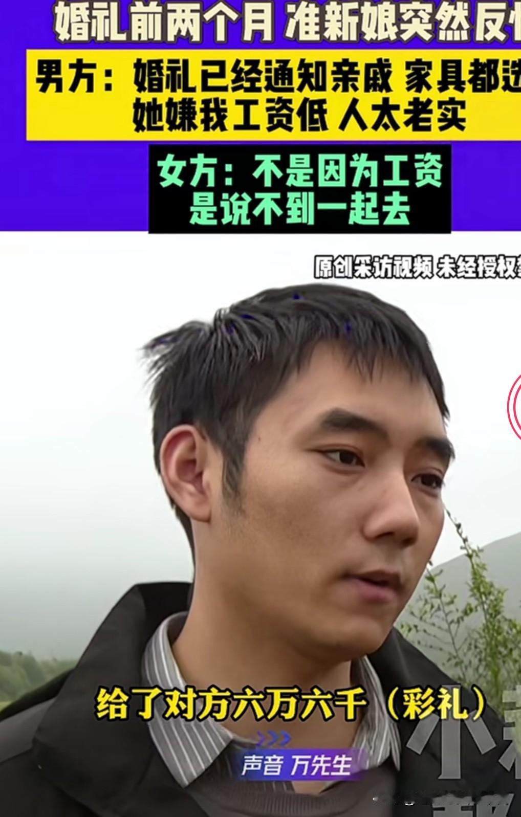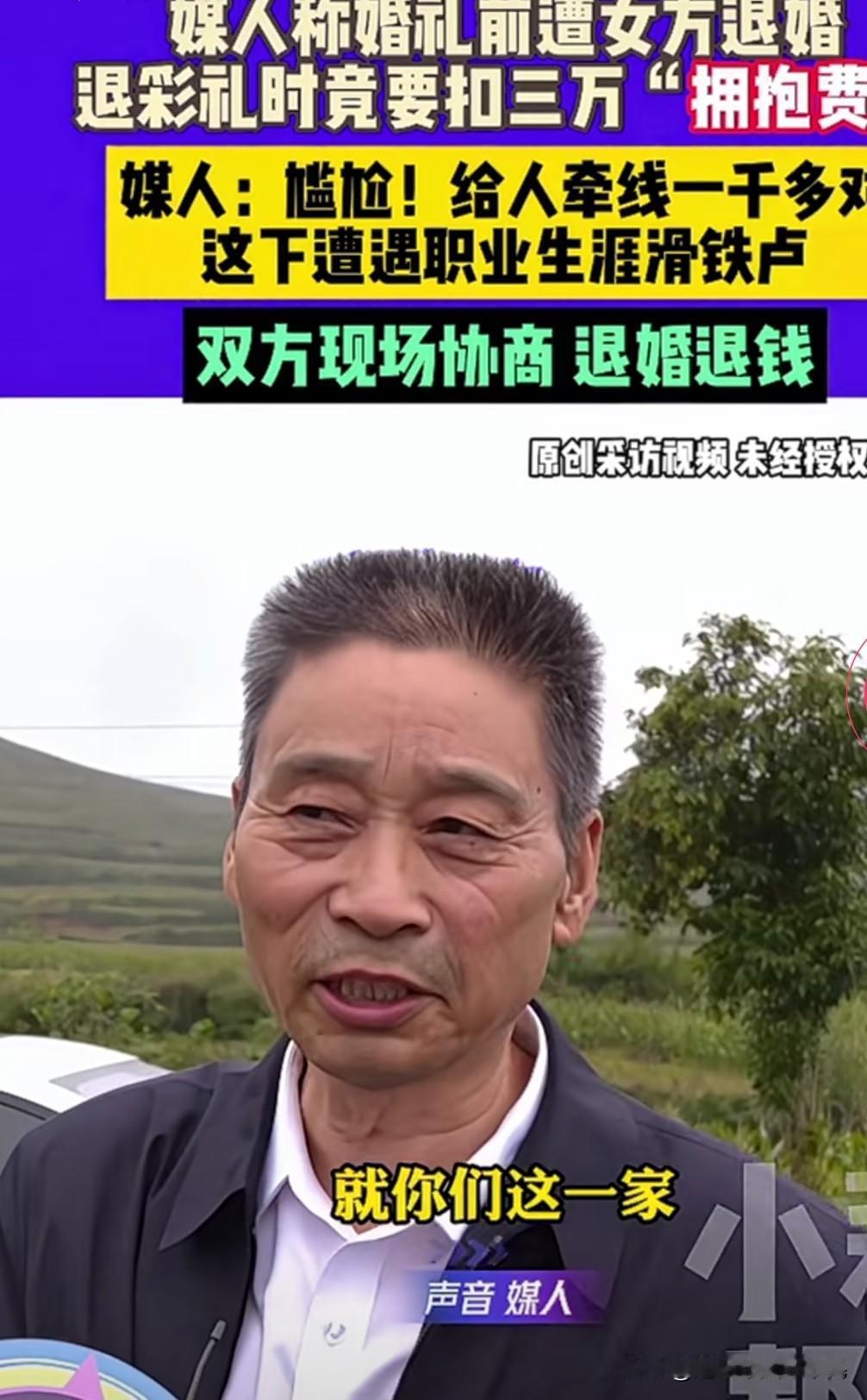 婚礼前两个月,准新娘突然反悔 男女双方经过媒人介绍,今年1月订婚,计划11月底办婚礼。见面礼,彩礼共计约20万,本来亲友已经通知,酒店,家具,都已经安排好,因女方觉得与男方没有共同话题,说不到一起,所以临近结婚,突然悔婚。但是女方只愿意退17万彩礼,其中的3万不退,是因为说那是拥抱费。 做了十几年媒人的大爷觉得非常的尴尬,他他表示自己十几年媒人生涯中牵线1000多对新人,从来没有遇到过这种扣下三万拥抱费的情况。 经过电视台的调解,两人现场协商,退了17万5。