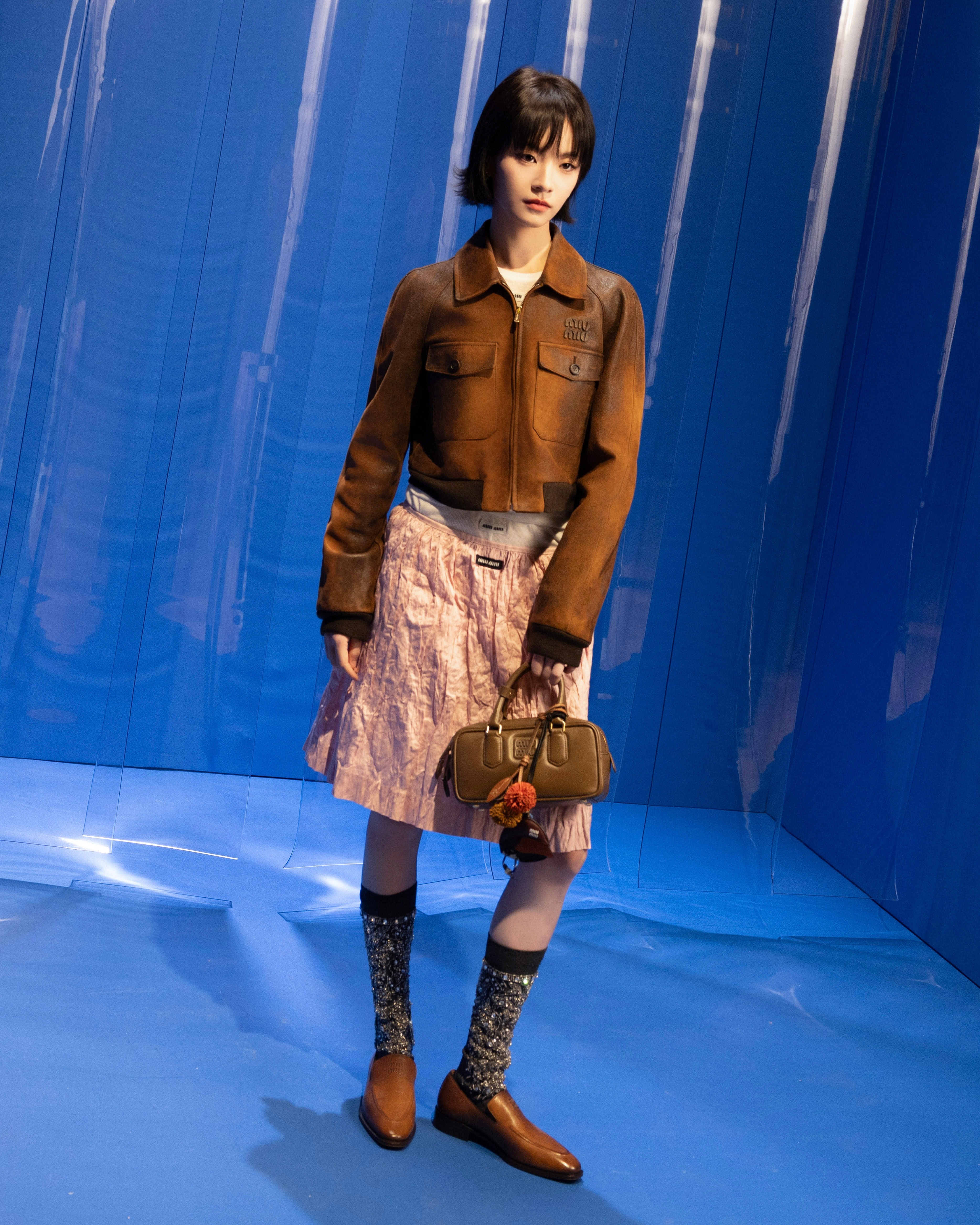 这些造型均通过色彩对冲 、材质拼接 、细节点睛等叠搭技巧 ,将 Miu Miu 标志性风格转化为可借鉴的日常语言 ,提供兼具艺术感与实穿性的穿搭新范本 。