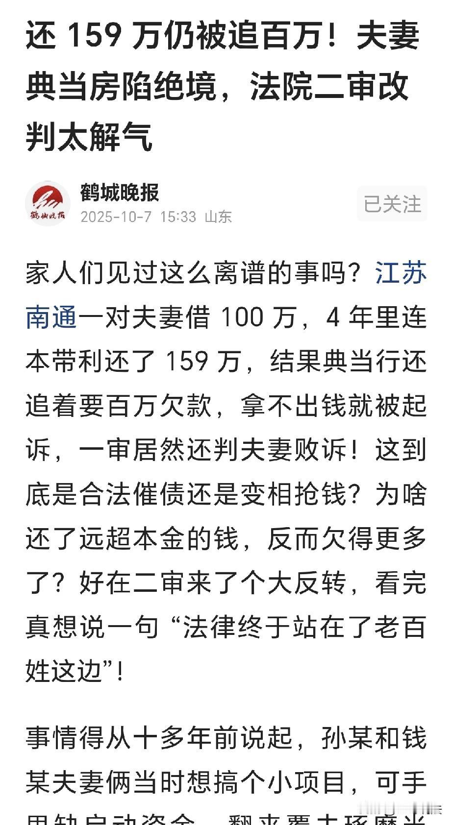 离谱!江苏南通,一对夫妻想做生意,把房子抵押到典当行抵押了100万元,典当行转钱的时候,扣了2.5万综合费,只给了夫妻97.5万,可万万没有想到,生意不好,到了赎房日期,俩人没钱,夫妻俩跟典当行商量,先付利息,等凑够钱再赎房,谁知付了4年,仅利息付了159万,夫妻俩实在还不起了,典当行告上法院,要求他们还100万本金,再按36%的年利率付剩余利息,夫妻俩懵了,我们都还了159万了,怎么还欠这么多?案件经过一审二审,结果令人意外! 孙某和钱某俩人是夫妻,十几年前,俩人干了一件离谱的事情。 那个时候,夫妻俩还年轻,看着别人做生意发财,夫妻俩忍不住也想投资个小项目。 按照他们的预期,只要把本金投入进去,好好的经营,很快就能获得大笔的利润。 可思来想去,都是空的,手里没钱,项目就不能启动,二人想去借钱,可亲戚们水平都差不多,谁也拿不出本钱,眼睁睁看着别人挣钱。 孙某钱某一打听,某家典当行可以典当东西,他们回家一看,只有房子值钱,俩人狠了狠心,决定把房子典当出去。 俩人来到典当行里,向老板说明了来意,双方签下《房产抵押借款合同》,约定借100万元,把房子抵押给他们。 可夫妻俩着急用钱,压根就没仔细看过合同,合同里有两个条款,第1款是: 月利率加月综合费率合计3%。 按照这个算法,年利率就是36%,高的无边无檐,夫妻俩却毫无知觉。 第2款是,如果没能按时赎房,每天要付千分之五的违约金!加上这一条计算,年利率高达180%! 夫妻俩瞪着双眼,愣是对合同看都没看,签完合同就等着拿钱,满心里都是去做生意。 可合同签完,典当行只给了他们97.5万,扣除的2.5万是综合费用。 夫妻俩毫不在乎,在100万里,2.5万只算是个小钱,夫妻俩眼都不眨,我们要赚的是大钱! 他俩心里想着,只要资金开始运转,项目肯定能够赚钱,等赚到的资金回笼,立刻就能把房子赎回来。 至于那点利息,应该没有多少,只要能赚钱,利息根本不算什么。 俩人立刻行动,满怀着希望开始经营,谁知经过一番努力下来,俩人发现,项目根本不像预期中挣钱。 时间一晃,到了赎房子的期限,可是钱没赚到,俩人大眼瞪着小眼。 房子如果不去赎回,那就成了一份绝当,如果成了绝当,典当行就能随意处置房子。 可房子是老屋,说什么也舍不得被人拿走,俩人跑去和典当行商量: 你先别卖我们的房子,我们先给你按时归还利息,等钱到位,我们立刻就来赎房。 谁知这样,刚好入了圈套,老板嘿嘿一笑,自然而然点头答应。 从此后夫妻起早贪黑,赚来的钱都还了利息,不知不觉还了4年,4年合计还了159.03万。 这账算来算去,怎么都还不完了,夫妻俩精疲力尽,可是利息还是不断的增加。 他们怎么都想不明白了,为啥利息能这么高,当初他们一共就借到手97.5万,4年还的利息早已经远远高出本金。 夫妻俩熬的憔悴不堪,实在没了办法,跑到典当行告诉老板,我们实在是还不动了。 老板立刻变脸,欠债还钱,天经地义,敢不还钱,等着吃官司吧! 典当行告到法院,要求夫妻俩先把100本金还了,另外,还要按照36% 的年利率,支付他们剩余的利息,另外还有综合费用。 孙某钱某顿时傻眼,我们都还了159 万了,怎么还欠这么多? 谁知一审判决,要他们归还典当行98.2万,外加各种后续费用。 夫妻俩看到判决,情绪几乎都要崩溃了,判决太不公平了,夫妻俩提起上诉。 《民法典》第670条规定: 借款的利息不得预先在本金中扣除。利息预先在本金中扣除的,应当按照实际借款数额返还借款并计算利息。 在本案中,典当行在出借100万元时,预先扣除了2.5万综合费,实际只给了夫妻97.5万,按照该条规定,应当以实际借款数额97.5万作为本金来计算利息。 《民法典》第680条规定: 禁止高利放贷,借款的利率不得违反有关规定。 本案中,典当行与夫妻约定的月利率加月综合费率合计3%,年利率达36%,还有每天千分之五的违约金,年利率高达180%,远远超过了法律规定的民间借贷利率上限,属于高利放贷,超出部分的利息不应得到支持。 《民法典》第676条规定: 借款人未按照约定的期限返还借款的,应当按照约定或者有关规定支付逾期利息。 虽然本案中夫妻二人与典当行约定了较高的逾期违约金,但该违约金过高,不符合法律规定,应按照合理的利率标准来计算逾期利息,即不超过合同成立时一年期LPR的4倍。 经过计算,按照97.5万的本金,24% 的年利率计算,夫妻4年应该支付典当行利息57.6万。 夫妻俩在4年之内还了159.03 万,扣除利息,还剩下的98.4万。 而他们接到手的本金只有97.5万,他们还的钱早就连本带利,还多还了一些。 二审判决,驳回了典当行的所有诉求,孙某钱某不用再还钱! 关注@王哥说法 多学法律少吃亏!