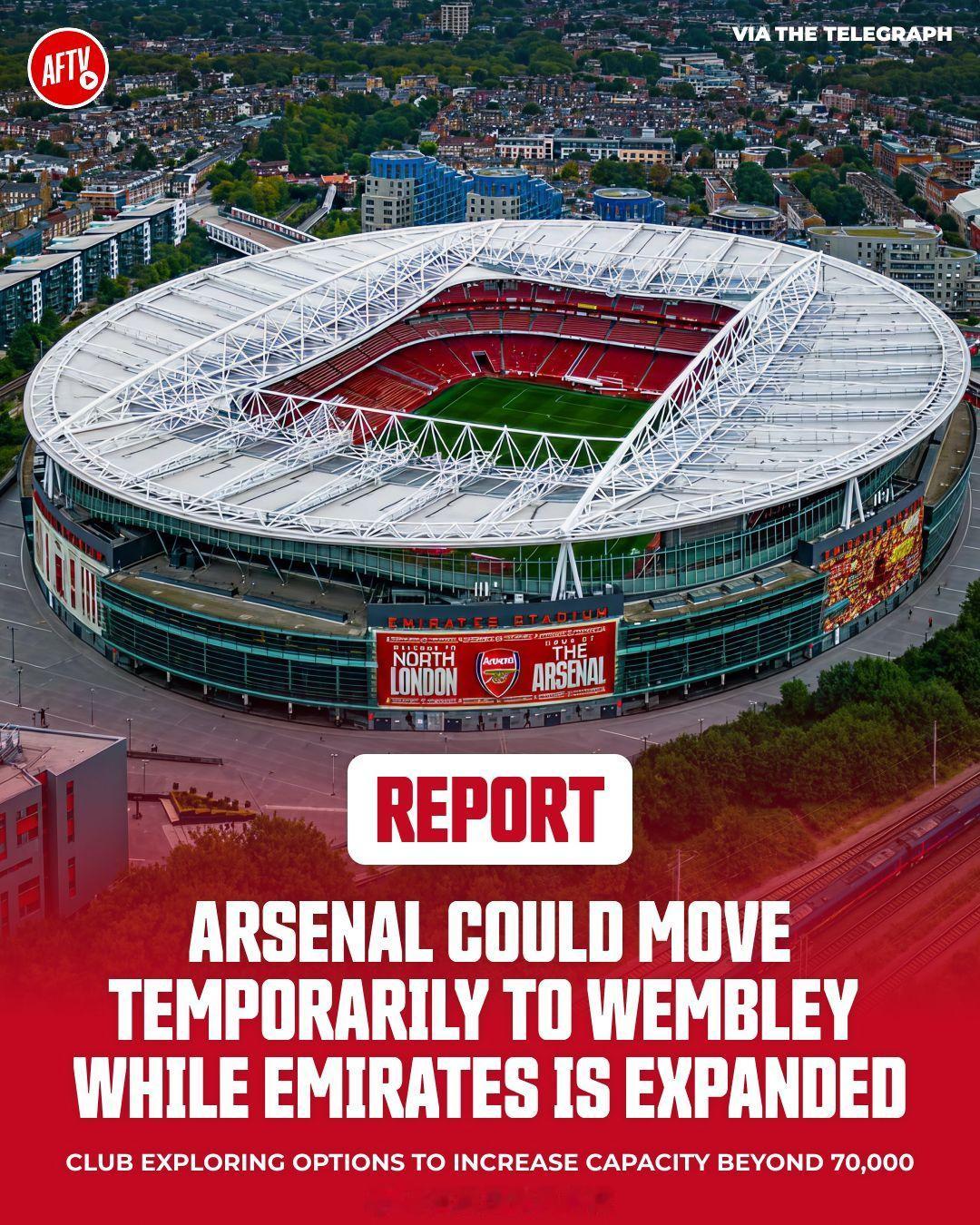 【阿森纳主场即将扩建】《每日电讯报》独家消息:阿森纳俱乐部,为了纪念从海布里球场搬进酋长球场20周年,将会对酋长球场进行扩建,目标是球场容量从目前的60700人提到70000人,超越热刺和西汉姆联的主场,成为伦敦地区最大的俱乐部主场。