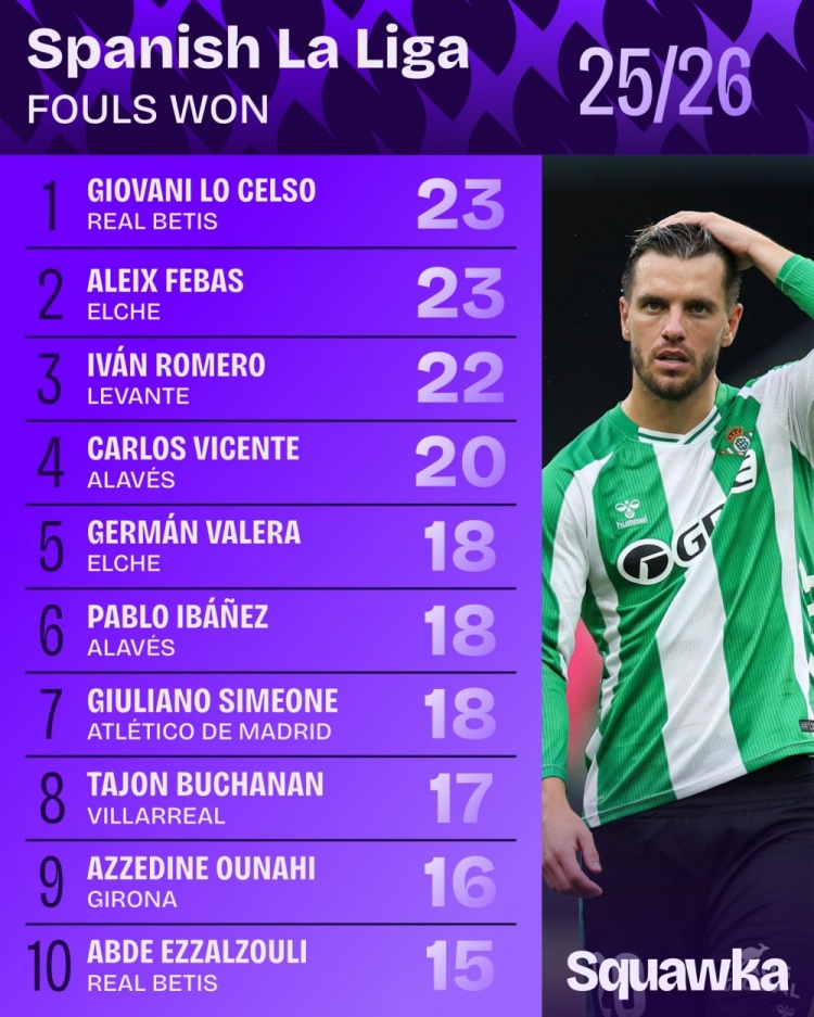 直播吧10月7日讯日前,Squawka统计了本赛季西甲被犯规次数排行,洛塞尔索23次居首,朱利亚诺-西蒙尼18次并列第五。