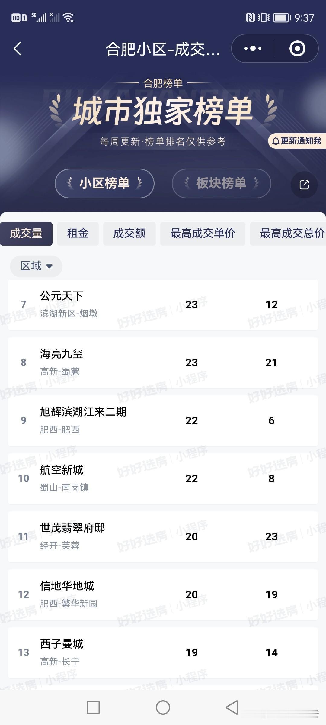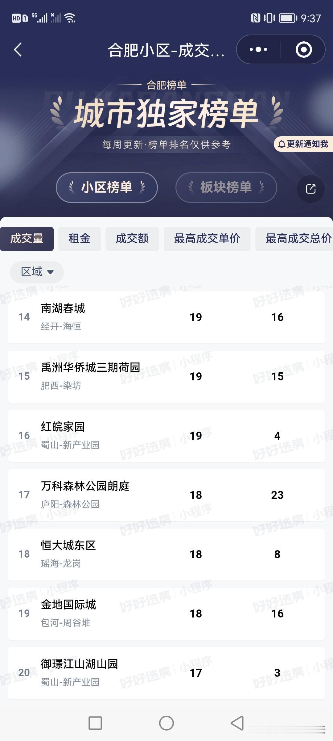 合肥最近三个月二手房成交量排名前20的小区。排名第一的是滨湖的,排名第二的是高新