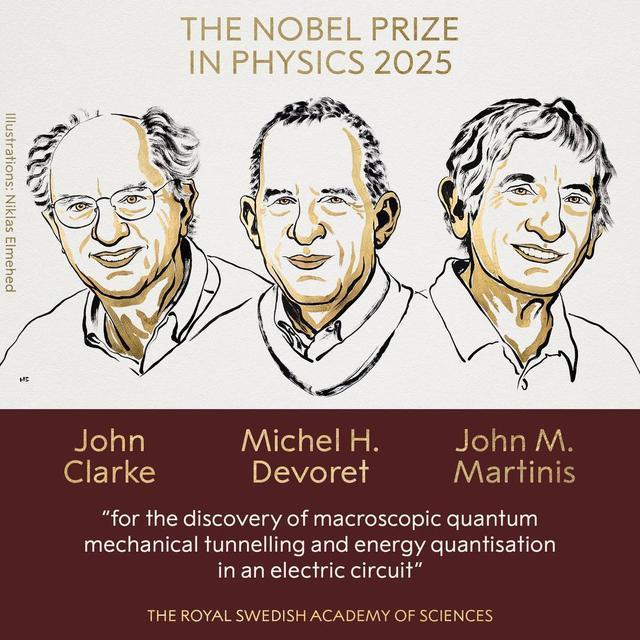北京时间10月7日晚,本年度的诺贝尔物理学奖得主正式揭晓:美国加州大学约翰·克拉克、美国耶鲁大学&加州大学米歇尔·德沃雷特、美国加州大学约翰·马丁尼斯获奖。获奖理由是“发现电路中的宏观量子力学隧穿和能量量子化”。