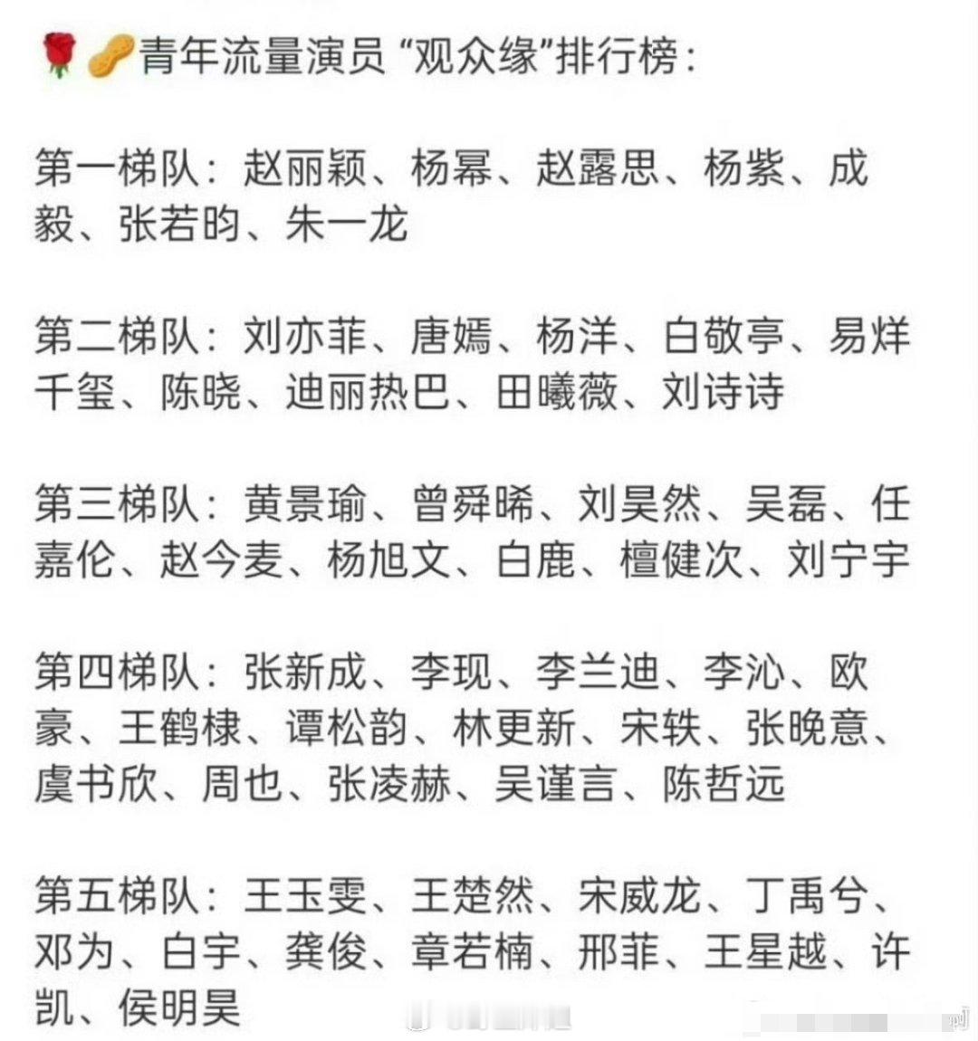 青年流量演员“观众缘”排行榜来了,一共分为五个梯队,赵丽颖、赵露思、杨幂、杨紫、