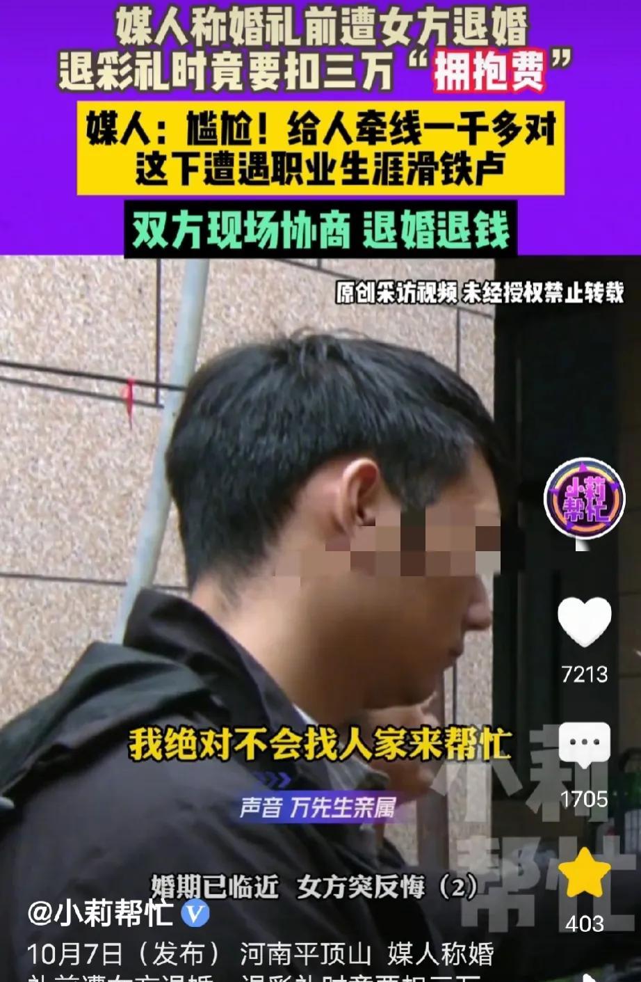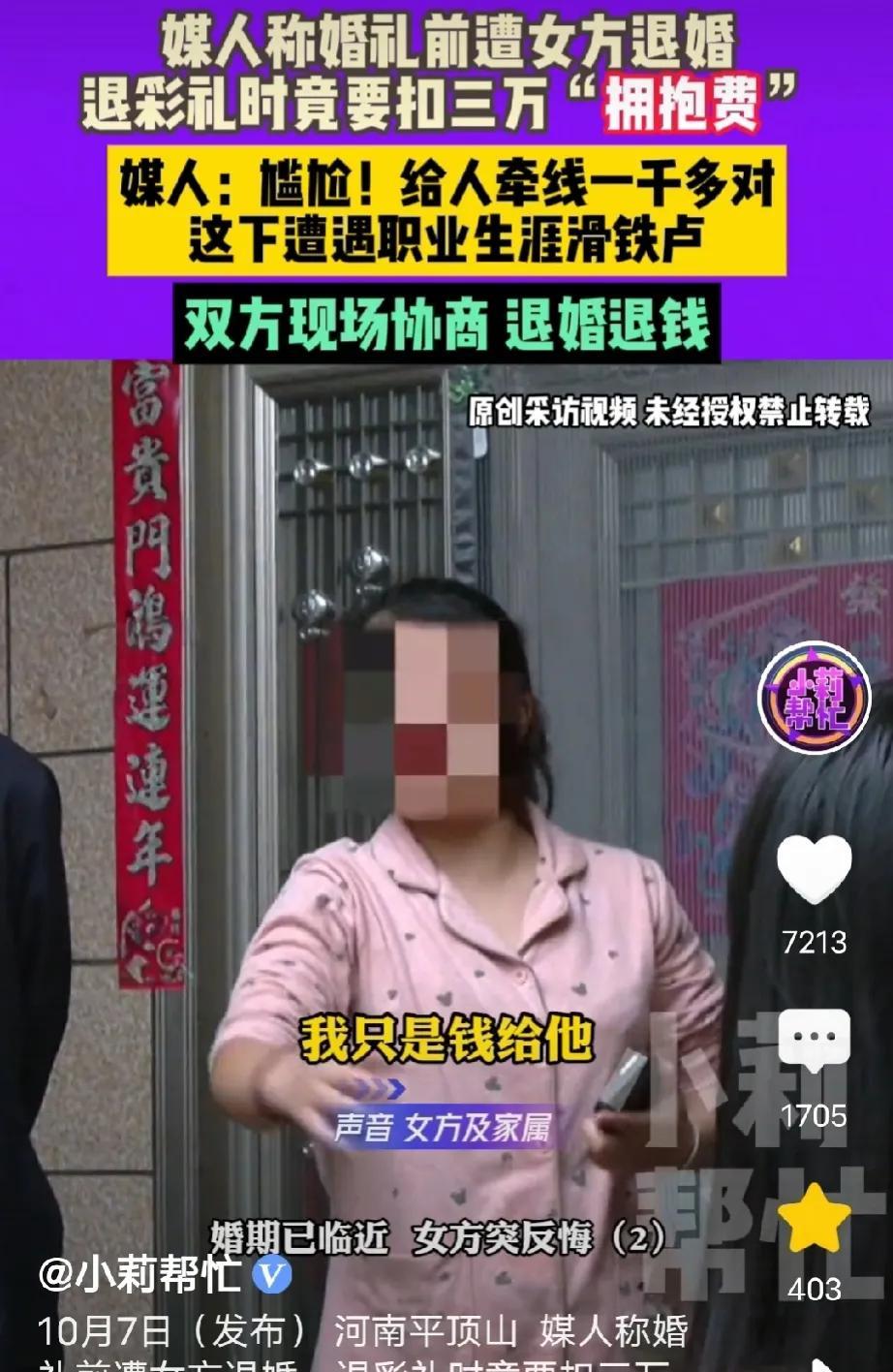 河南平顶山,男子花了20万筹备婚礼,请柬发了、婚纱照拍了,婚宴酒店也订好了,没想到,婚期将近女方突然临时变卦,说什么都不愿意嫁了,男子气愤不已,要求退还包过彩礼和各种礼金加起来20万块钱,女子表示退钱可以,但是拍婚纱照时,你拥抱了我,得扣除3万元,媒人:我活了70多岁,介绍1000多对新人,第一次见到拥抱还扣钱的。 2024年万先生在媒人的介绍下认识一女孩,两人聊了一段时间后确定恋爱关系。 万先生和家人对女孩都很满意,两人都是奔着结婚而谈的。 女孩第一次去万先生家,他家人很高兴也很重视,第一次上门就给女方包了24000元的红包。 两人恋爱几个月后,在家人的催促下,于今年1月份订婚。 订婚当天万先生给女方6.6万彩礼,并买了6万元“四金”,改口费也花了几万元。 订婚后不久,女友说自己手机坏了,万先生又花了将近一万块钱给她买个新手机。 在之后的相处中,万先生还给女友买了电脑、手表等各种礼物,也花了小几万。 订婚后两人的感情越来越稳定,双方父母提议,尽快给小情侣办婚礼,完成他们的人生大事。 万先生和女友也没意见,在父母的安排下,计划今年11月29日举办婚礼。 为了这一次婚礼能办好、办成功,万先生一家子很是花心思,他们在几个月之前就各种筹备。 包过确定婚宴场地,置办各种婚礼需要的东西,选定伴娘伴郎,还有预定多少台婚车,计划宴请多少亲朋好友等,万先生一家把一切都做得面面俱到。 9月份前万先生和女友也拍了婚纱照,就连请柬都写好了,也口头通知了部分好友。 一切都准备就绪了,就等着良辰吉日的到来。 可让万先生没想到的是,接近9月底的时候,女友突然毫无征兆地跟他提?分手,女友说这个婚不结了。 一开始,万先生以为女友因为筹备婚礼事宜太累了,闹脾气,过两天就好了。 可几天后,女友依然坚定地要求退婚,万先生着急了,问她什么原因,女友却只字未提就说不想嫁了。 万先生无奈找到媒人,媒人通过了解,女方侧面跟他表示,是因为万先生太过老实了,两人在一起没有共同话题,而且万先生工资太低。 媒人努力说和,但女方依然坚持退婚。 媒人没办法,只能劝万先生放弃,万先生一家表示,既然女方坚决退婚,那就把花出去的20万块钱给退回来。 可女方不乐意了,一直不谈退钱的事,媒人经过多次沟通做思想工作,她终于松口,愿意退钱。 但是女方提出,拍婚纱照的时候,万先生拥抱了她,得扣除“拥抱费”3万元。 媒人大叔一听觉得很奇葩,但是他没法说服女方。 为了解决好这一件事,媒人大叔找来记者调解。 大叔告诉记者,他今年79岁了,给1000多对情侣说媒,扣除拥抱费这种事,他还是第一次听说。 之后记者跟着大叔和万先生来到女方家,记者问女孩为什么突然退婚,女孩说,他和万先生之间没有任何矛盾,就是单纯不想结了。 女孩父亲对记者说,之所以退婚是两人之间没有共同的话题,合不来。 记者又问,你们有没有说过扣除拥抱费这件事。 女孩说,她的确说过,因为两人去拍婚纱照的时候,是万先生提出要拥抱她。 记者问,拥抱不是相互的吗,你也抱了他,媒人大叔上前补充说,我介绍了那么多对,就是你们最难说话。 女孩父亲一听,气得上前推搡大叔,还好被记者给拉开了。 不过,最终在记者的努力调解和劝说下,双方心平气和协商,女方同意当场退还17.5万元,万先生也接受了这个方案。 从法律角度,如何分析这个事件呢? 《最高人民法院关于适用〈民法典〉婚姻家庭编的解释(一)》第5条规定,当事人请求返还按照习俗给付彩礼的,如果查明属于以下情形,人民法院应当予以支持:(一)双方未办理结婚登记手续;(二)双方办理结婚登记手续但确未共同生活;(三)婚前给付并导致给付人生活困难。” 在本案中,万先生与女方订婚后并未办理结婚登记手续,根据该法条规定,万先生有权要求女方返还按照习俗给付的彩礼。 另外,《最高人民法院关于审理涉彩礼纠纷案件适用法律若干问题的规定》第2条规定,禁止借婚姻索取财物。 一方以彩礼为名借婚姻索取财物,另一方要求返还的,人民法院应予支持。” 女方以拍婚纱照时万先生拥抱了她为由,要求扣除3万元,这种行为属于借婚姻索取财物,缺乏合理的法律依据,万先生可以依据该法条要求女方全额返还彩礼及其他相关礼金。 最后,我想说,这事儿女方做得确实不地道。人家把婚礼都准备好了,你临时说不嫁,还冒出个“拥抱费”,这简直是拿别人的真心开玩笑。 彩礼和各种礼金本来就是为结婚才花的,婚不结了,理应全额退还。最后退了17.5万,算是双方各让一步。 在这里提醒大家,以后遇到这种事,先小人后君子,转账留凭证,贵重礼物事先说清楚,别让感情被金钱绑架。 关注@猫眼学法 品读案例故事,学习法律经验