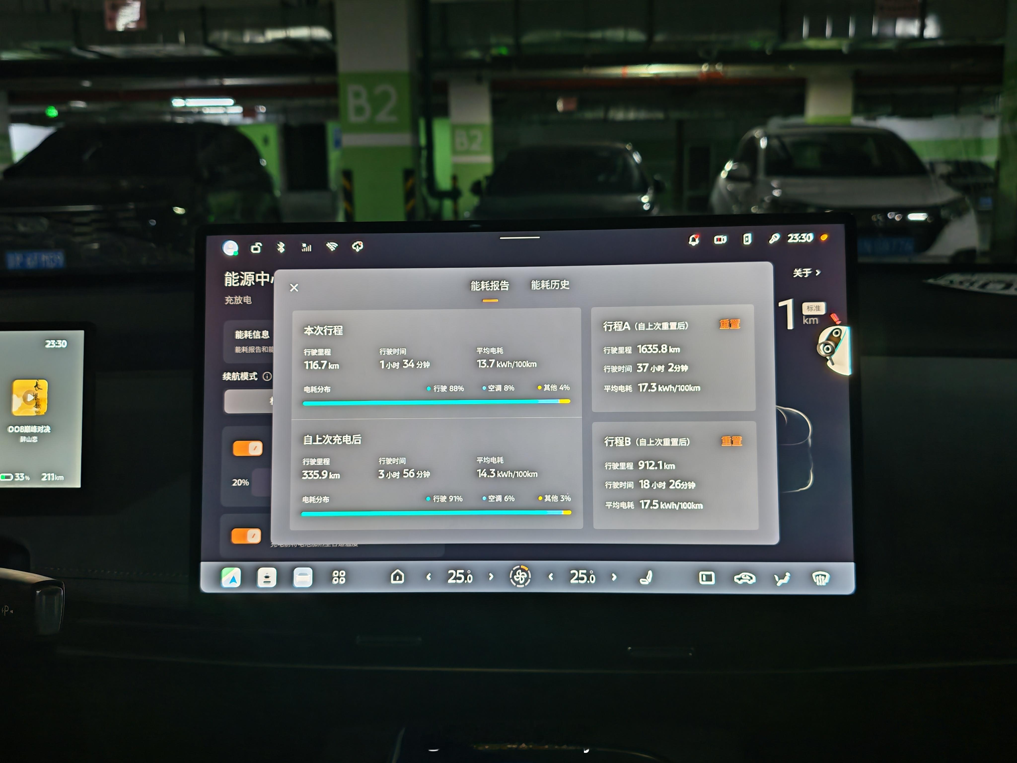 回来就是下坡路居多了,出发电量表显93%续航显示585Km,到目的地以后表显续航33%,剩余里程211Km。