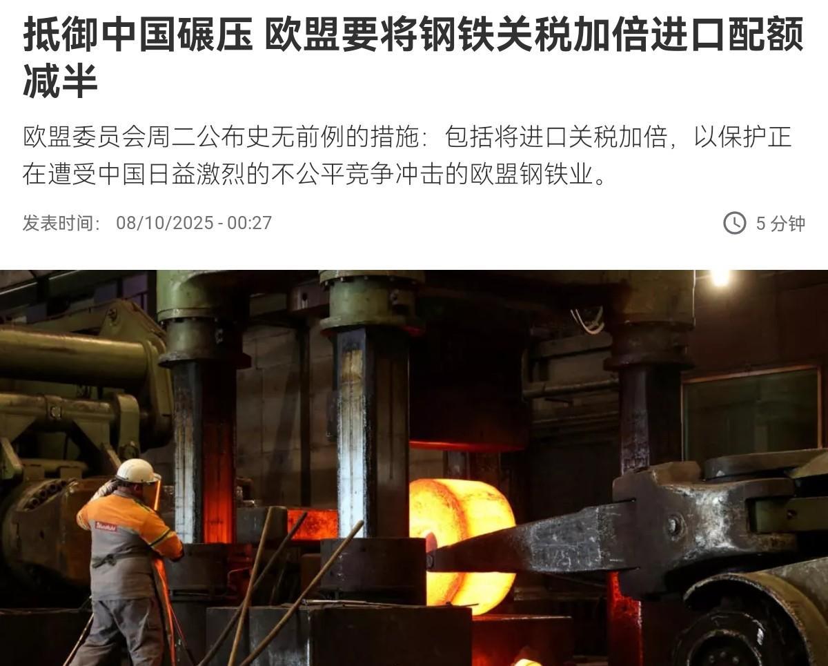 欧盟这是完全讨打的行为,我们肯定不会惯着!10月8日,根据法新社报道,欧盟突然对我们出手了。欧盟委员会公布史无前例的措施,包括将进口关税加倍,以保护正在遭受中国日益激烈的“不公平竞争”冲击的欧盟钢铁业。不仅如此,欧盟还宣布,将每年可免税进口到欧盟的外国钢铁配额减少47%。 也就是说,免税配额钢铁将减少至 1830 万吨。欧盟委员会副主席塞若表示:欧洲钢铁行业正处于崩溃的边缘。我们将保护它,以便它能够投资、脱碳,从而重新恢复竞争力。法媒表示,中国被指维持产能过剩,压低全球价格,结果导致许多欧洲钢铁厂关闭。 很显然,明明是欧洲企业自身竞争力不足,欧盟却搬弄是非,给我们扣一个“不公平竞争”的帽子,妄图设置贸易壁垒,以保护欧洲的产业。我们倒是想问的是一贯标榜自由贸易的欧洲,这个时候怎么不讲自由贸易了呢?欧洲不是一再的表示要遵守以规则为基础的国际秩序吗?欧洲的规则难道就是越发的紧闭市场的大门,实施贸易保护主义吗? 欧洲的所作所为,这不是典型的说一套做一套的双标嘴脸吗?竞争不过我们,就把自己标榜的东西仍在一边,这无疑是非常的虚伪。当然,欧盟这样做,这必然是会有后果的。我们肯定也会出手,捍卫自身利益。欧洲这是讨打的行为,我们不会惯着,也不能惯着。