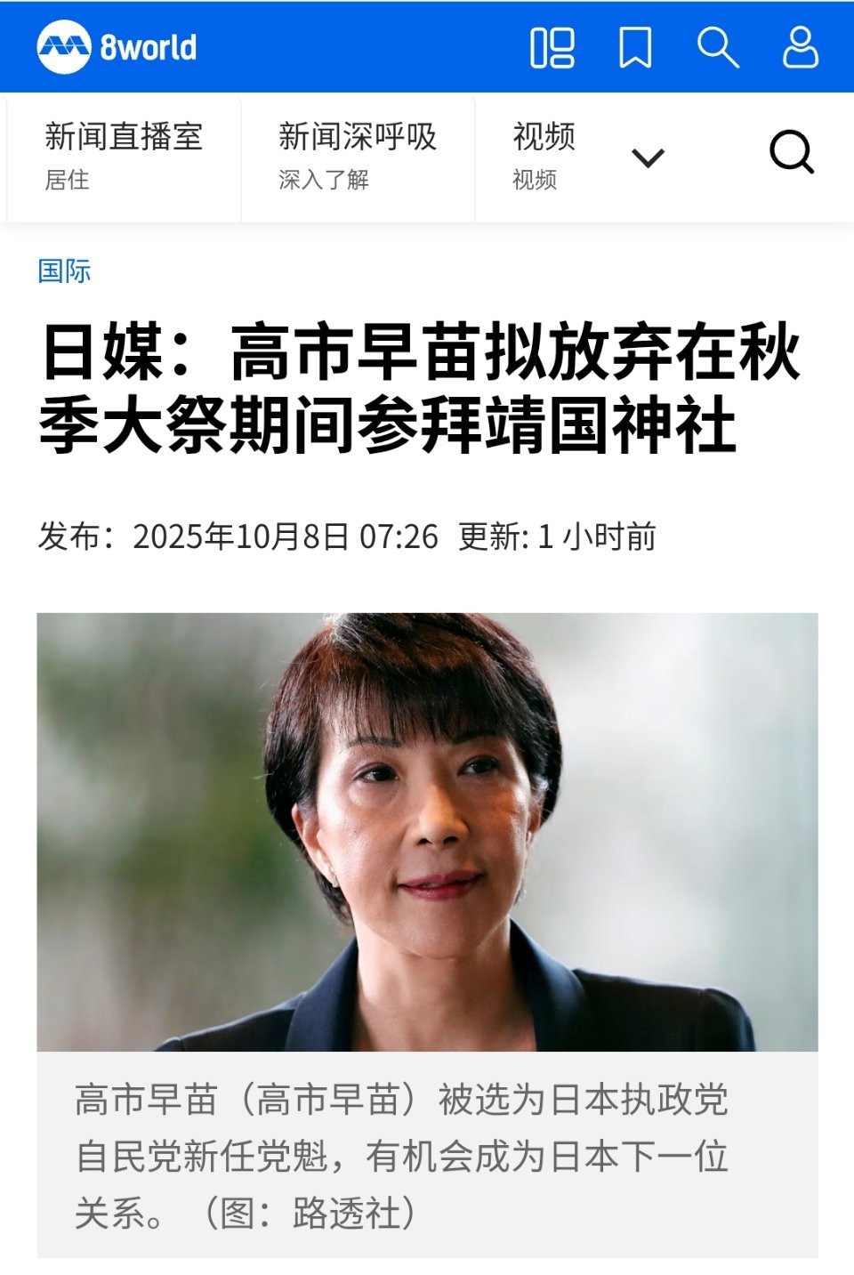 日媒:高市早苗拟放弃在秋季大祭期间参拜靖国神社。