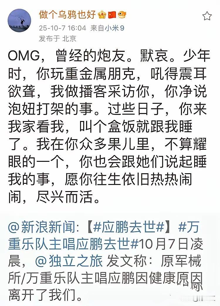 木子美这位初代网红,可能将炮友关系当做一种信仰了吧,当然也可能是当做一种博人眼球的手段。可不论如何,做人做事是否还是应该有一定底线?一个摇滚歌手,因病去世了,喜欢他的可以怀念他,不喜欢的可以不说话。可您大白于天下说:我们是炮友,我怀念他。当然,真的还是假的,当事人已经去世了,没法其实也没必要非要求证个真假了,但你木大网红是否有吃人血馒头的嫌疑? 奉劝木大网红,真的没必要在一个已经去世的人身上搞一波流量了,中国人讲死了,死了,一死百了,让逝者安息吧!