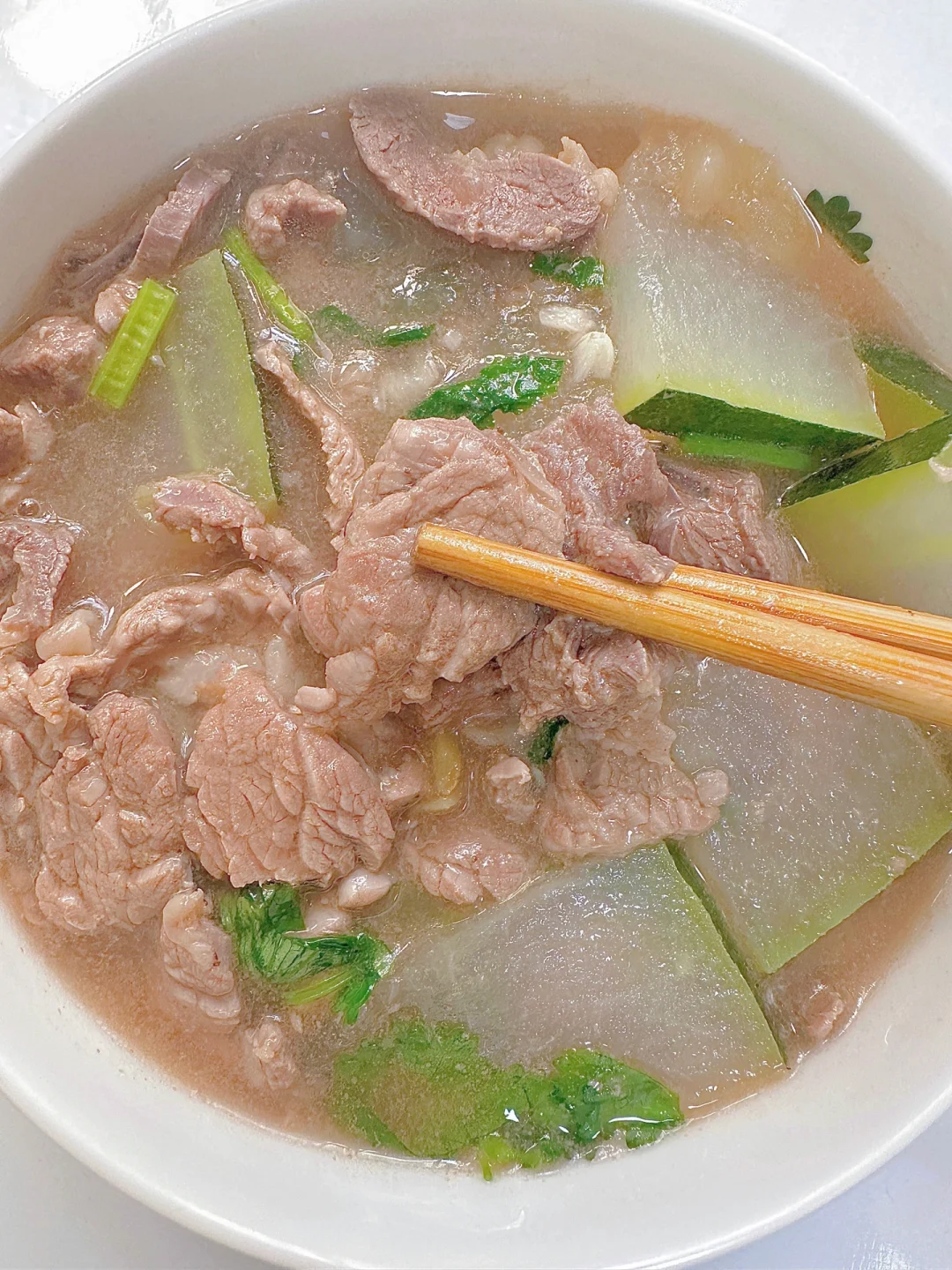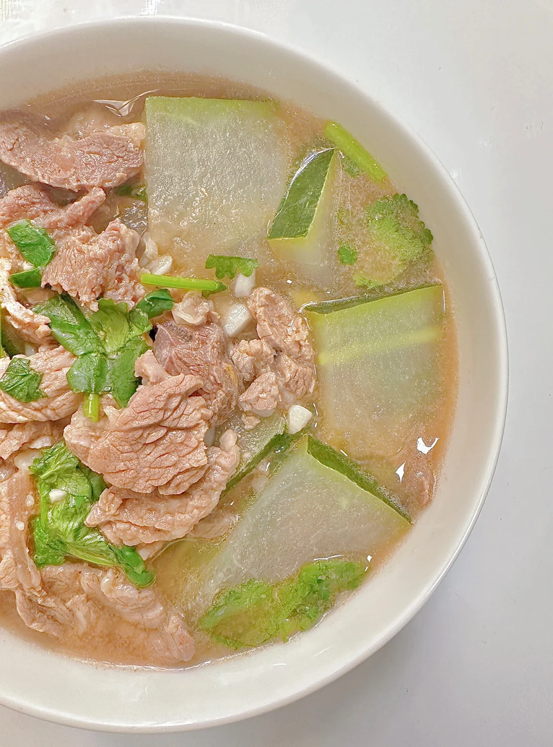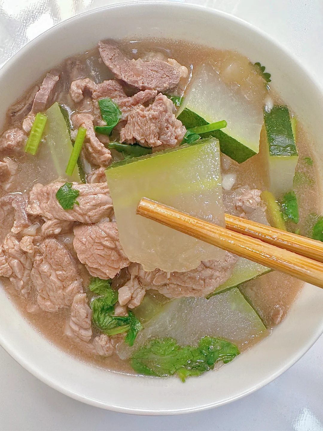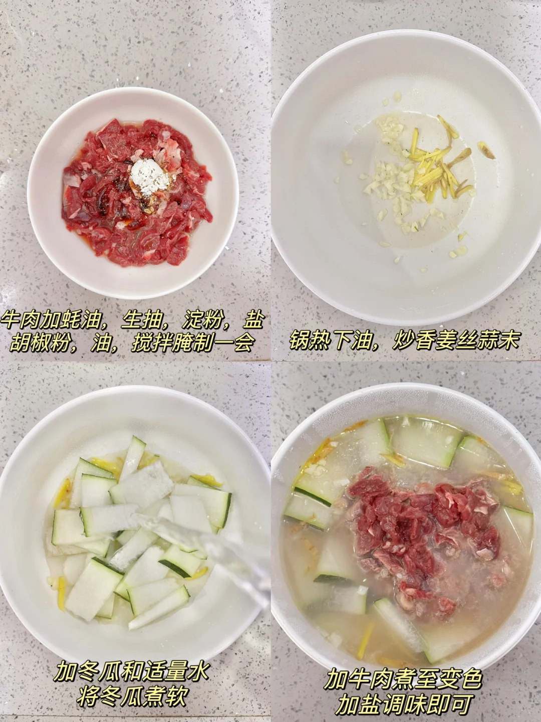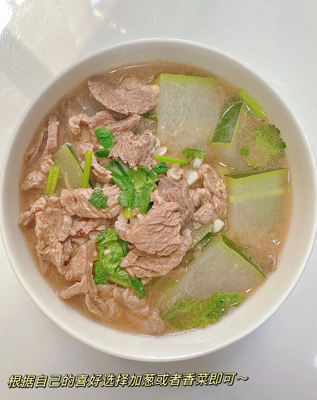 2️⃣冬瓜切块(可以不去皮,冬瓜皮去湿气的效果最好,介意的宝可以削一削)姜丝蒜末爆香,加入冬瓜,加适量水炖煮2分钟,和我一样喜欢软烂一些的,可以煮3-5分钟左右[偷笑R]