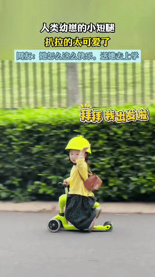 一个小朋友戴着黄色头盔,骑着同色系的小车车。她小短腿不停地扒拉着,动作特别可爱。出发的时候,还热情地挥手,那欢快的样子,感染了好多人,网友都忍不住调侃,看她这么快乐,想送她去上学呢。兜风的小朋友 童真瞬间