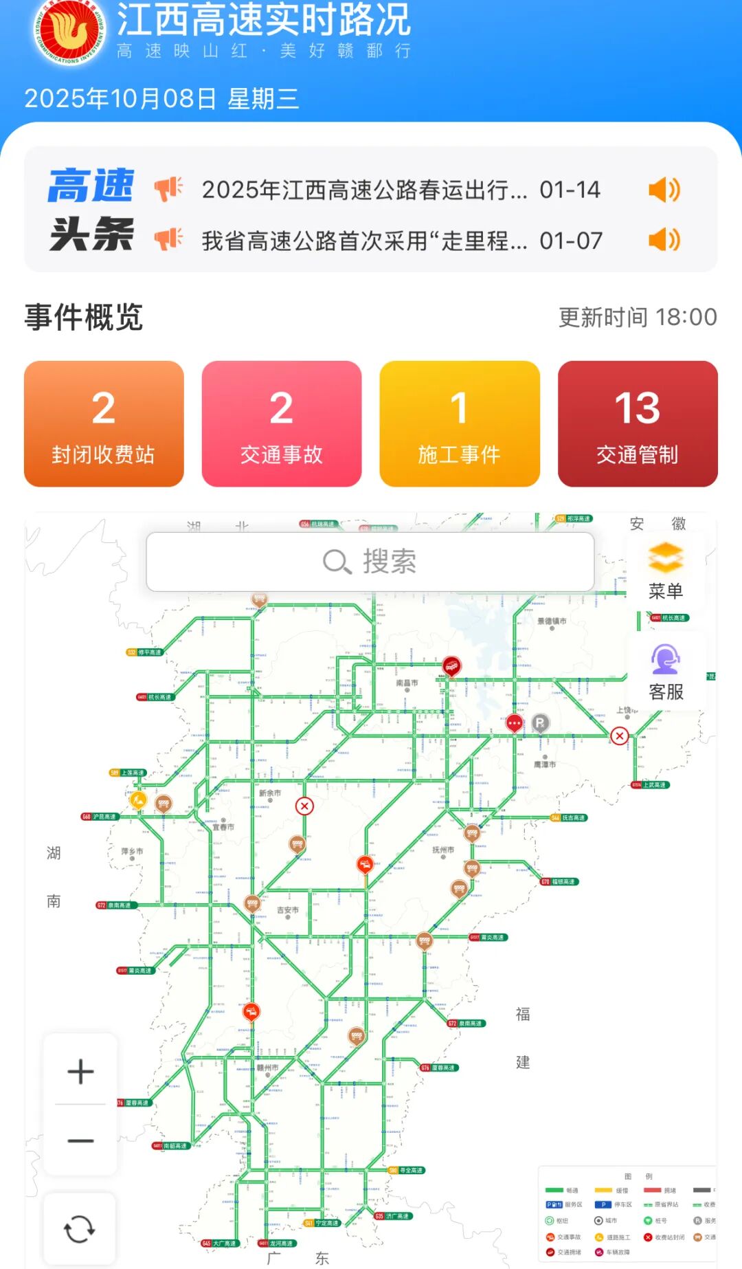 江西省交通监控指挥中心发布最新路况信息,截至10月8日17:35,具体如下: