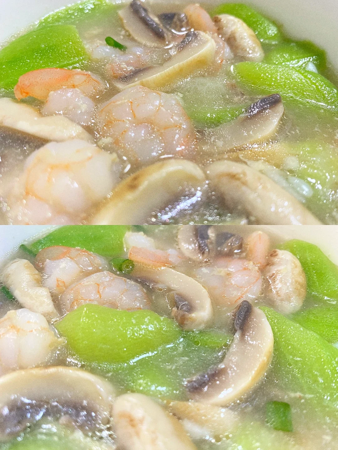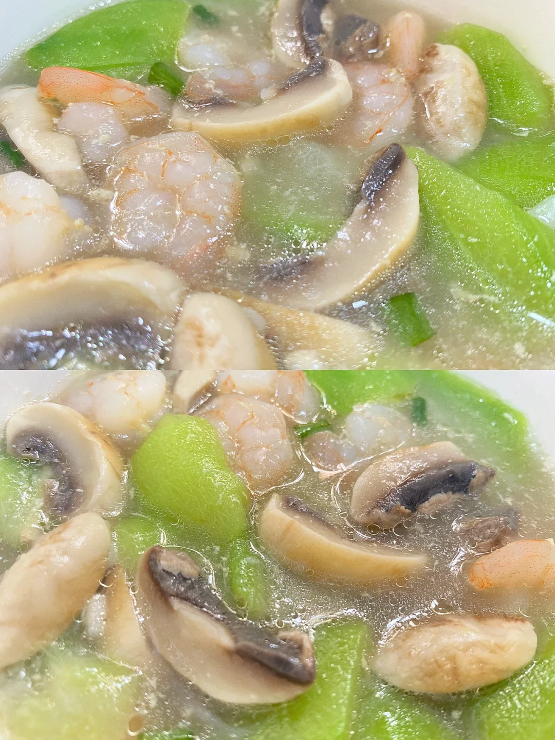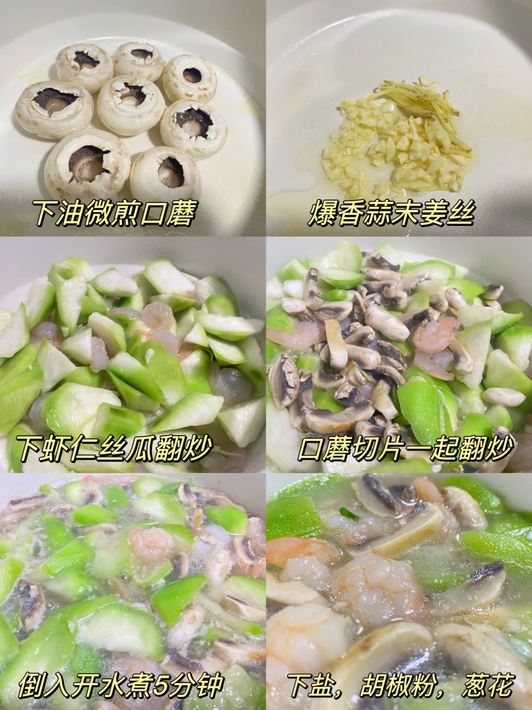 最近真是太太太爱口蘑啦! 怎么煮怎么好喝! 真真真是最近的心头好呀! ✅材料 口蘑6-8个,丝瓜半根,虾仁100g ✅步骤 1️⃣丝瓜去皮切块 2️⃣口蘑洗净去柱,下油稍微煎一下,然后拿出来切片,或者直接拿厨房剪剪成片 3️⃣爆香蒜末姜丝,下丝瓜和虾仁翻炒一会,再加入口蘑 4️⃣最后加开水炖煮5分钟,加盐,胡椒粉和葱末就可以啦 快喊上你减肥的小姐妹一起喝起来~低脂又美味!