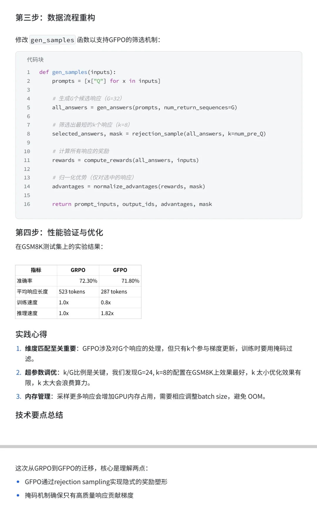 这次实验基于我之前跑过的github上的 GRPO 代码,尝试融入微软提出但还没有开源的 GFPO 思路,在 GSM8K 数学推理任务上做的一次小改造。核心改动主要集中在引入 rejection sampling 和 掩码机制:前者通过筛选候选响应来缩短推理长度,后者确保只有高质量的响应参与梯度更新。