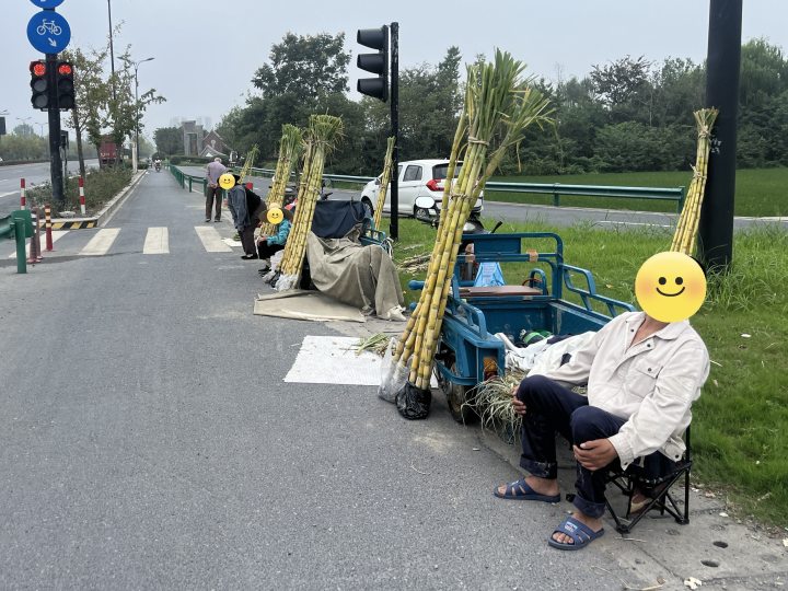 趁着假期有空,天气小姐姐昨天专门跑了一趟,果然一到荷禹路和杭南路交叉口,就看到一捆捆青色的本地甘蔗,整齐地摆在村口叫卖。每个摊主的造型也是相当统一,戴着草帽,坐在一辆拉货的小三轮上(旁),甘蔗上面用稻草捆好,下面用塑料袋装好,想来是怕甘蔗上的泥土弄脏买甘蔗人的车。问了几个,都说是杭南村的村民,卖的都是自家种的青皮甘蔗。
