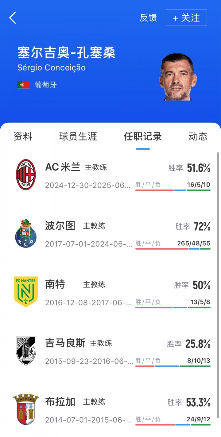 孔塞桑出生于1974年,曾担任波尔图、AC米兰等球队主帅,今夏卸任米兰主帅。