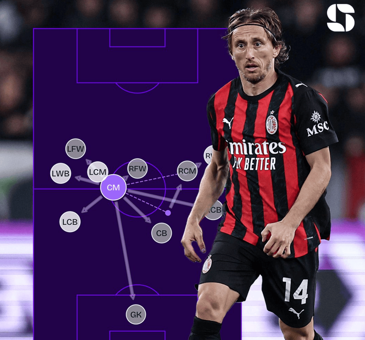 Squawka数据统计,莫德里奇本赛季意甲已经完成了368次传球,是联赛中传球次数最多的球员。