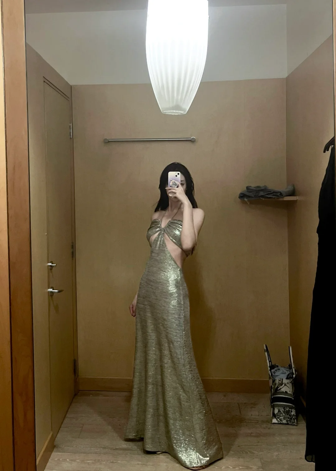 香槟色裙子的设计好辣 腰部镂空刚好可以露出腰线 裙子弹力超大舒适感满分