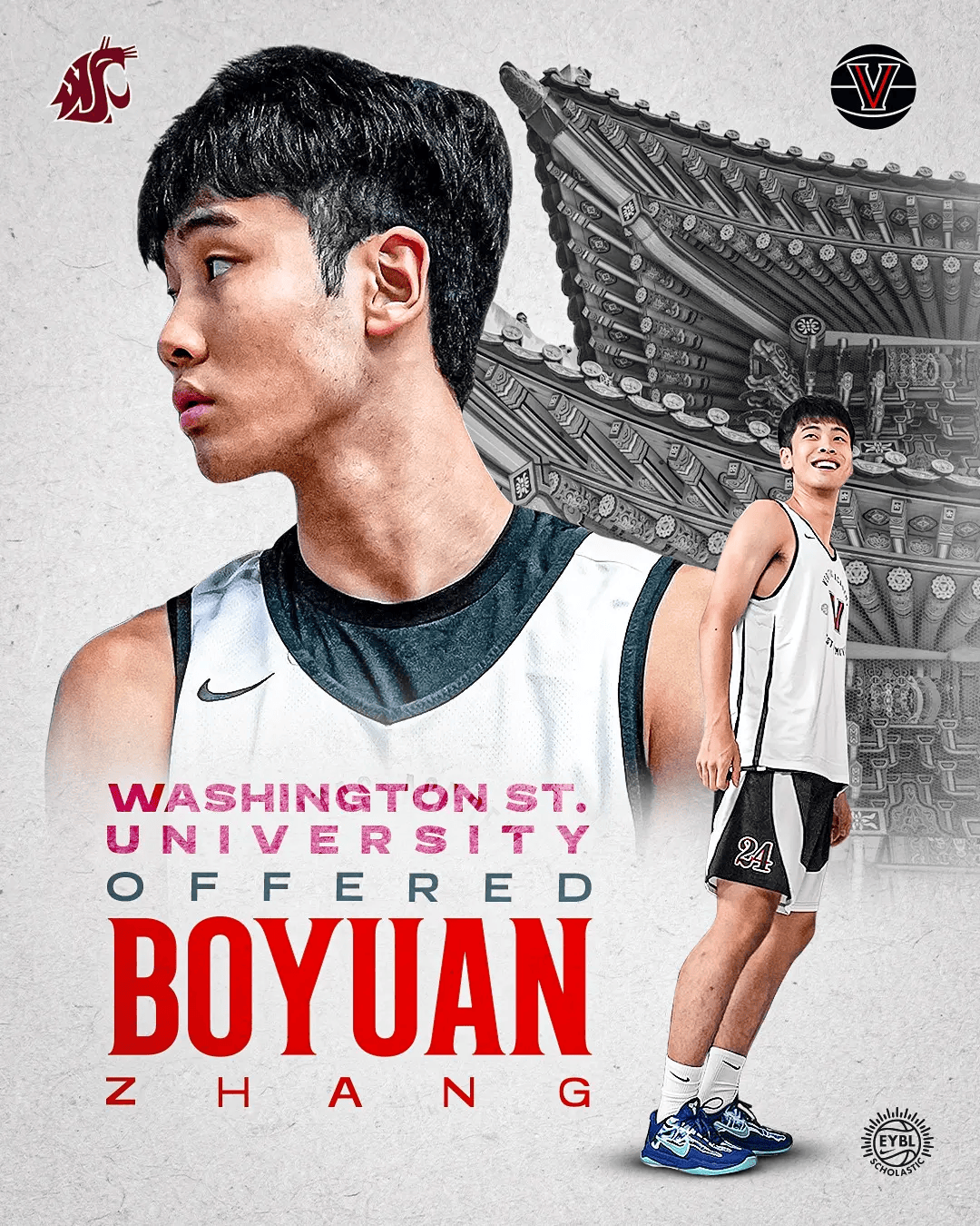 配文:张博源又收获一份新Offer!来自WashingtonStateUniversity。(华盛顿州立大学)别忘了,这可是培养出NBA全明星KlayThompson的学校。问题来了——他会选择追随水花兄弟前辈的脚步吗?Keepgoing…