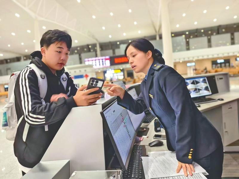 7时,第一批前往成都、重庆方向的旅客陆续进站,候车室里很快热闹起来。唐利便开启高强度工作:播放开站广播、分发当日日班计划、检查各岗位广播系统……忙完这些,又立刻化身引导员,左右手交替示意,将旅客精准引向对应检票口。从“车票改签过一次还能再改吗”“哪里能充电”,到联系重点旅客接送、帮寻遗失物品,她日均要回复四五百次咨询,是候车室里的C位“百事通”。