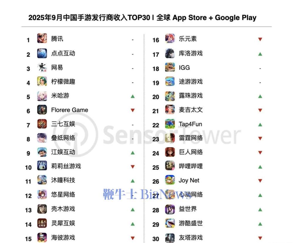 中国发行商TOP30中,腾讯稳居榜首。其《三角洲行动》9月17日上线新赛季“烈火冲天”,当日登顶中国iOS畅销榜,收入环比大涨76%,加之《王者荣耀》《和平精英》表现亮眼,助力腾讯领跑。