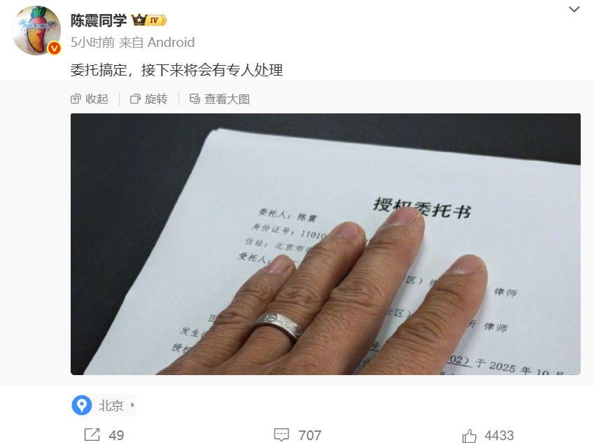 10月9日,针对3日发生的北京万寿路交通事故,知名车评人陈震又发两条微博谈论该事故的后续处理情况。他在微博中表示,他已经委托律师,并称会有专人处理此事。在评论区,陈震表示是为了“配合对方律师”。