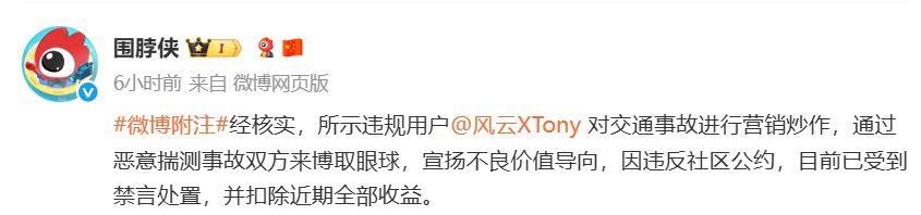 10月9日,微博社区观察员官方账号@围脖侠发布消息称,用户@风云XTony目前已受到禁言处置,并扣除近期全部收益。其表示,该用户是对交通事故进行营销炒作,通过恶意揣测事故双方来博取眼球,宣扬不良价值导向,违反社区公约。