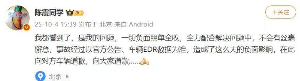 同日,陈震就“劳斯莱斯车祸”一事发文致歉:“我都看到了,是我的问题,一切负面照单全收,全力配合解决问题中,不会有丝毫懈怠,事故经过以官方公告、车辆EDR数据为准,造成了这么大的负面影响,在此向对方车辆道歉,向大家道歉。