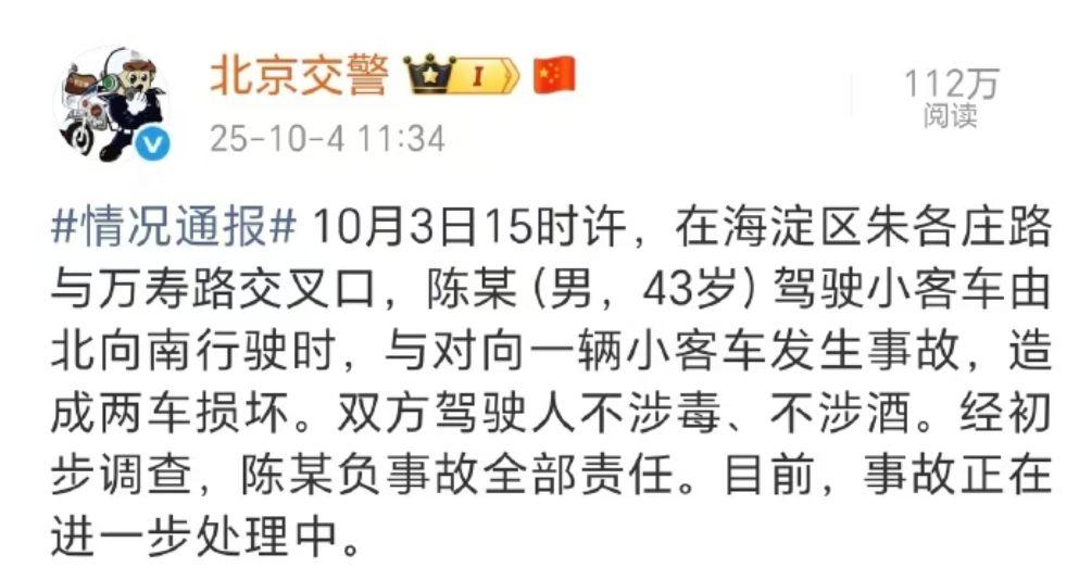 10月4日,北京交警发布情况通报:10月3日15时许,在海淀区朱各庄路与万寿路交叉口,陈某(男,43岁)驾驶小客车由北向南行驶时,与对向一辆小客车发生事故,造成两车损坏。双方驾驶人不涉毒、不涉酒。经初步调查,陈某负事故全部责任。目前,事故正在进一步处理中。