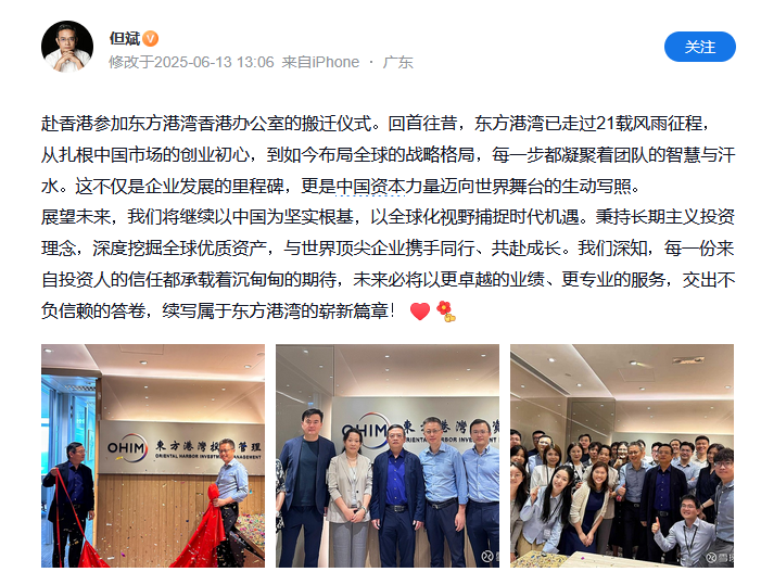 据公开资料,2011年但斌成立东方港湾(香港)投资管理有限公司。今年6月13日,但斌曾公开表示,从扎根中国,到布局全球,这不仅是企业发展的里程碑,更是中国资本力量迈向世界舞台的生动写照。“展望未来,我们将继续以中国为坚实根基,以全球化视野捕捉时代机遇。”