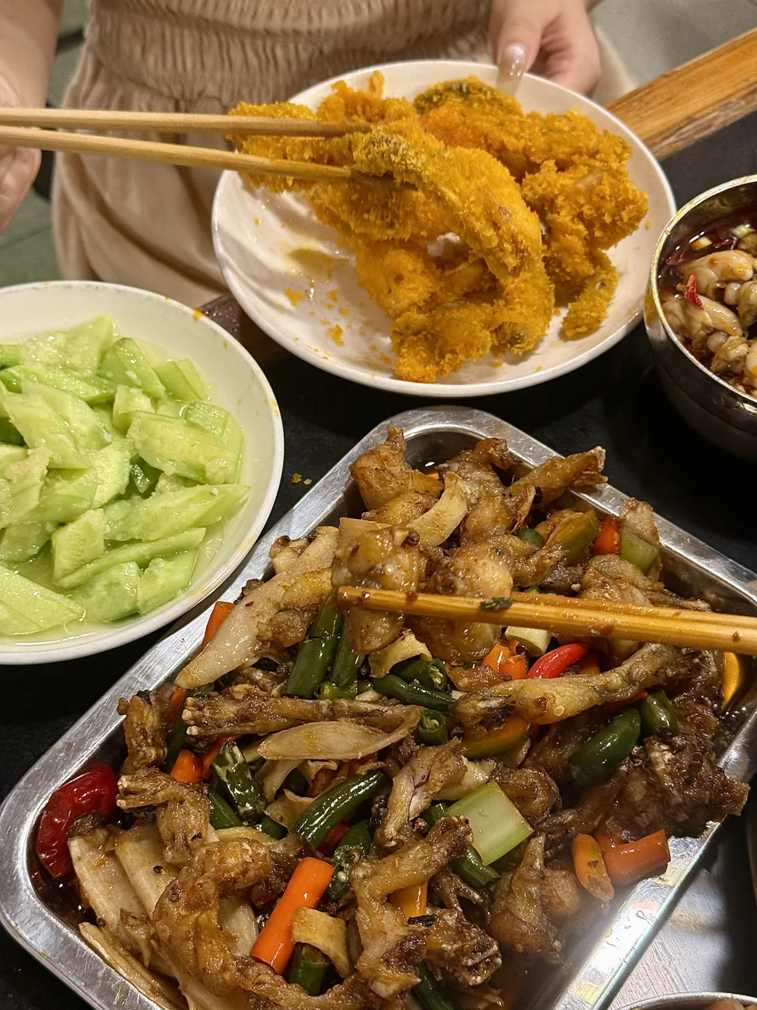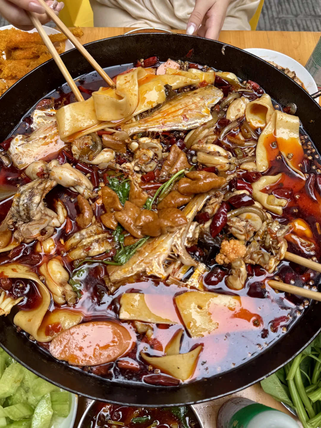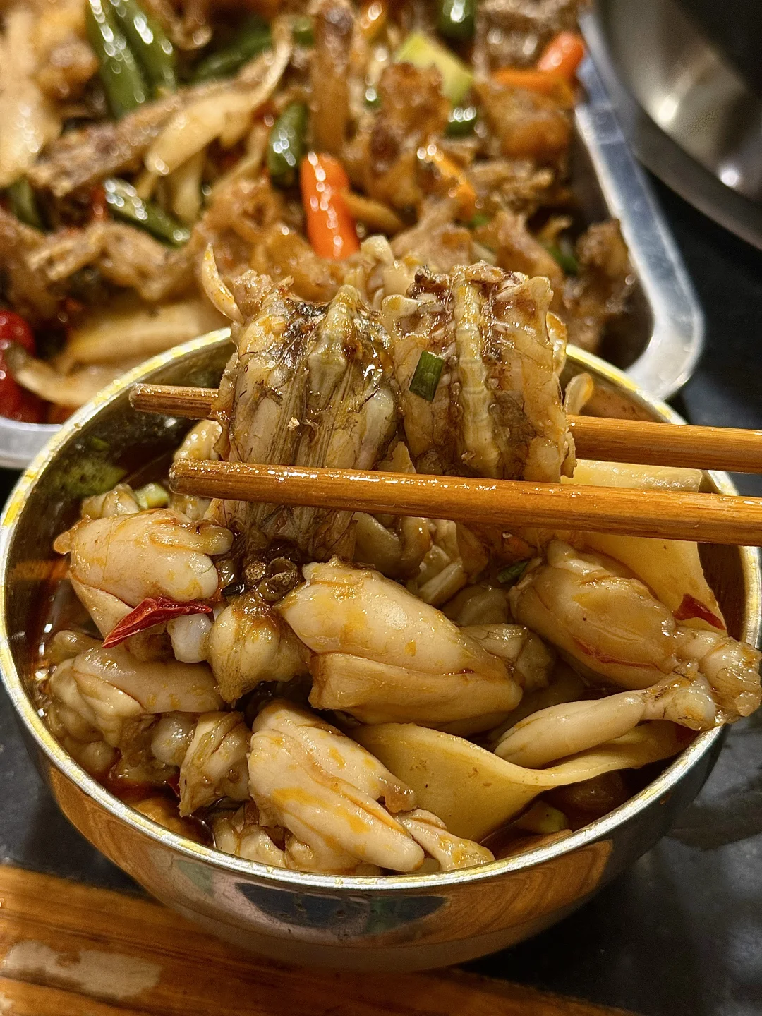 本地朋友给我们推荐的鱼火锅,专门吃蛙蛙和耗儿鱼的,藏在居民楼下的,离解放碑很近!!“咸蛋黄椒盐蛙”的味道很独特,很少吃到这种,好吃得一直嗦手指!“姜爆美蛙”很麻很辣,但是吃到嘴里真的很爽很巴适hhhh!!手工苕粉也很劲道,Q Q 弹弹的……人均jia格也很便宜,才六十多。