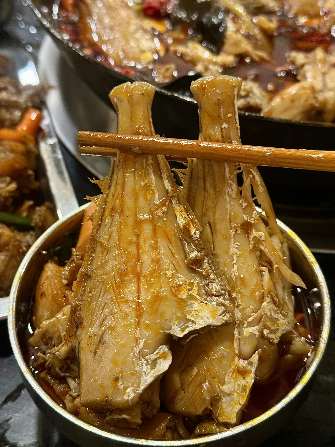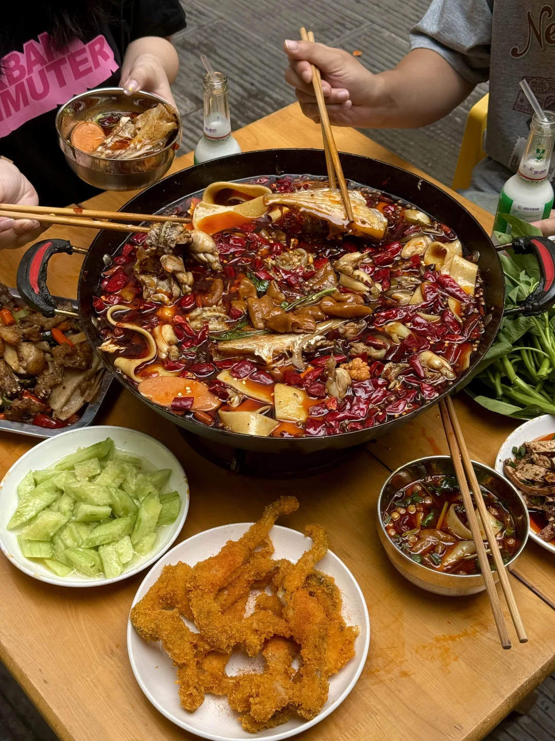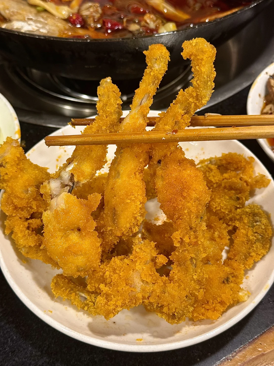 本地朋友给我们推荐的鱼火锅,专门吃蛙蛙和耗儿鱼的,藏在居民楼下的,离解放碑很近!!“咸蛋黄椒盐蛙”的味道很独特,很少吃到这种,好吃得一直嗦手指!“姜爆美蛙”很麻很辣,但是吃到嘴里真的很爽很巴适hhhh!!手工苕粉也很劲道,Q Q 弹弹的……人均jia格也很便宜,才六十多。