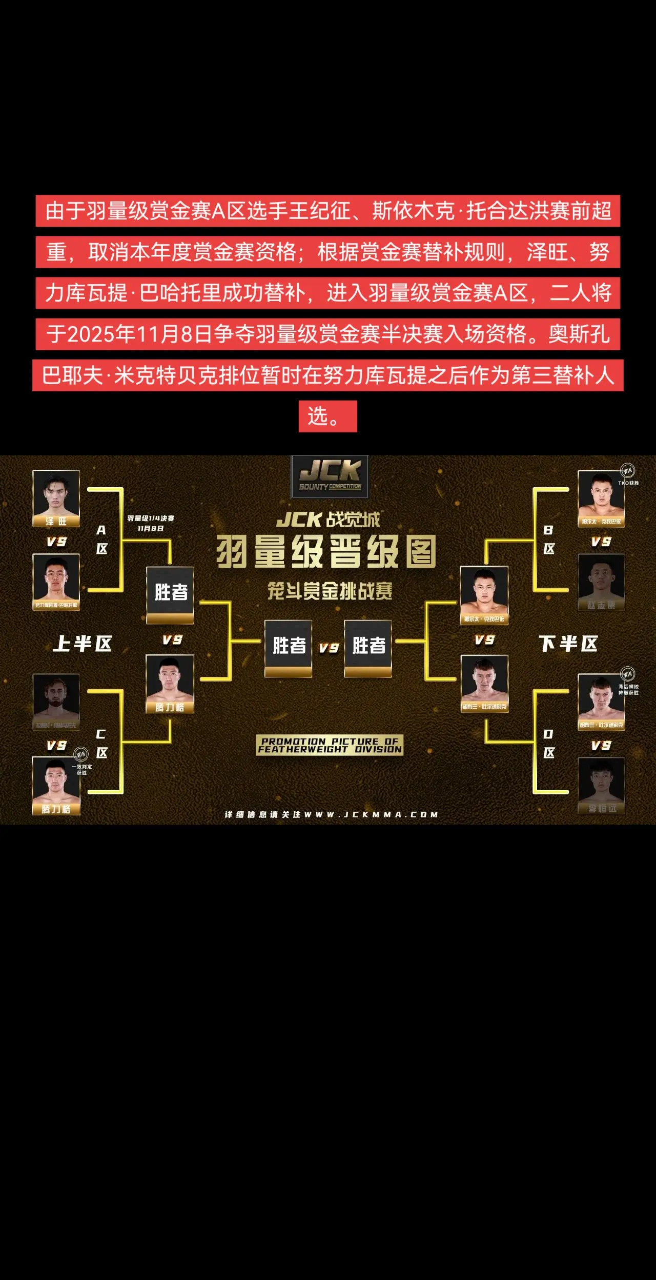 泽旺回归。由于羽量级赏金赛A区选手王纪征、斯依木克·托合达洪赛前超重,取消本年度赏金赛资格;根据赏金赛替补规则,泽旺、努力库瓦提·巴哈托里成功替补,进入羽量级赏金赛A区,二人将于2025年11月8日争夺羽量级赏金赛半决赛入场资格。奥斯孔巴耶夫·米克特贝克排位暂时在努力库瓦提之后作为第三替补人选。
