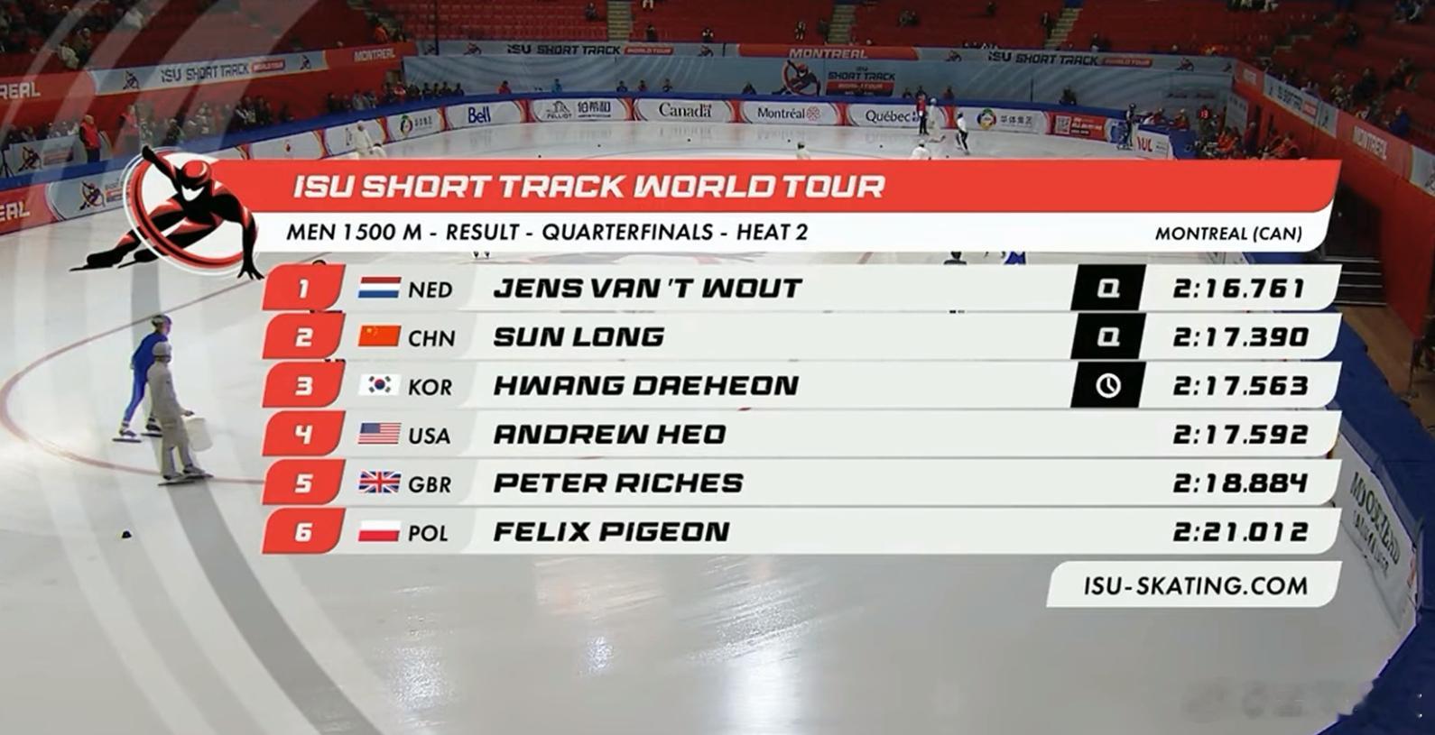该组范特伍特2分16秒761排名第一,孙龙2分17秒390第二,黄大宪2分17秒563,虽然被孙龙绝杀,但黄大宪还是以小Q身份进入半决赛。短道速滑世界巡回赛短道速滑孙龙