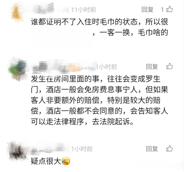 关于血迹浴巾送检的问题,赵店长称,目前浴巾已经封存,由酒店保管。对于客人提出的赔偿诉求,赵店长无法接受:“他提的是带有处罚性质的要求,不合理。我们愿意出于服务态度,免掉第一晚房费,算是表达我们的诚意。”