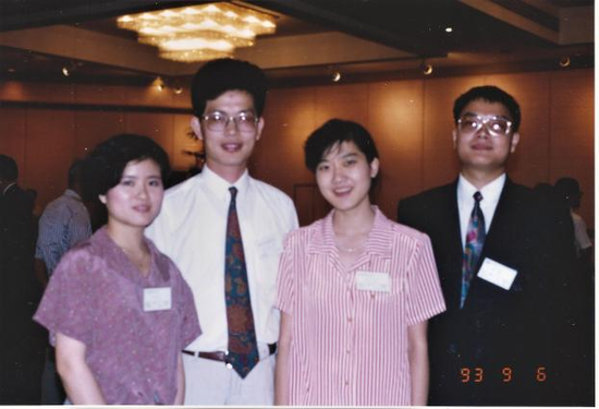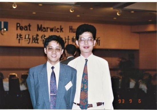 1993年底左右,管总请我去万国谈了一次。主要目的是想找一个强有力的财务方面的高管。他说,万国现家大业大,但各地营业部像是加盟店,产权、资金、客户保证金、会计核算都不集中,总部没法管控,这很危险。因此,希望我推荐一位合适的人,来解决这一顽症。我回上财思考一段时间后向他推荐了两位上财会计系78级同学,其中之一是1991年11月由上海金融高等专科学校教务处副处长跳到毕马威香港和上海工作的晓蔚。如下是此前我在毕马威上海一次活动时和晓蔚,以及刚从上财和上外联合培养的第一届“国际会计”专业毕业去毕马威工作的三位学生的合影。这三位同学比曾在万国工作过的王高芳和周群高一届。合影中的晓蔚就是他到万国工作之初的形象。