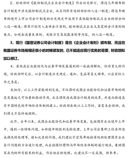 第三,协助证监会和财政部制定了《证券公司会计制度》。这也是在证监会首会办去申万调研,并与晓蔚、顾旭等深入讨论后做成的重要基础性工作。当时晓蔚说,证券公司连全面、系统、明确的统一会计制度都没有,公司内部控制和决策,以及监管机构的监管和政策制定都没有基本的信息来源。根据他们的建议,1997年4月时任证监会主席在我帮助起草的给时任财政部部长的信中建议加快制定《证券公司会计制度》(见如下信中的第3条建议)。