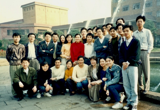 王高芳和周群是上财和上外合办的第二届“国际会计”专业班的同学。他们前两年住上外,此间,上外老师教外语课为主,上财老师教专业课为辅;后两年住上财,此间,上财老师教专业课为主,上外老师教外语课为辅。我在他们大二时教他们全英文的《中级会计》,用的是美国原版教材,约1,500页厚。如此厚,重约1公斤,充满复杂交易、精致会计处理、晦涩难懂会计准则规定的教科书,对原一门心思在外语上的大二学生的压力真不小。以下为他们毕业前的合影,一排左一是周群,一排左四为王高芳,王高芳为他们班的班长。当时我37岁,已是教授、博导、系主任。