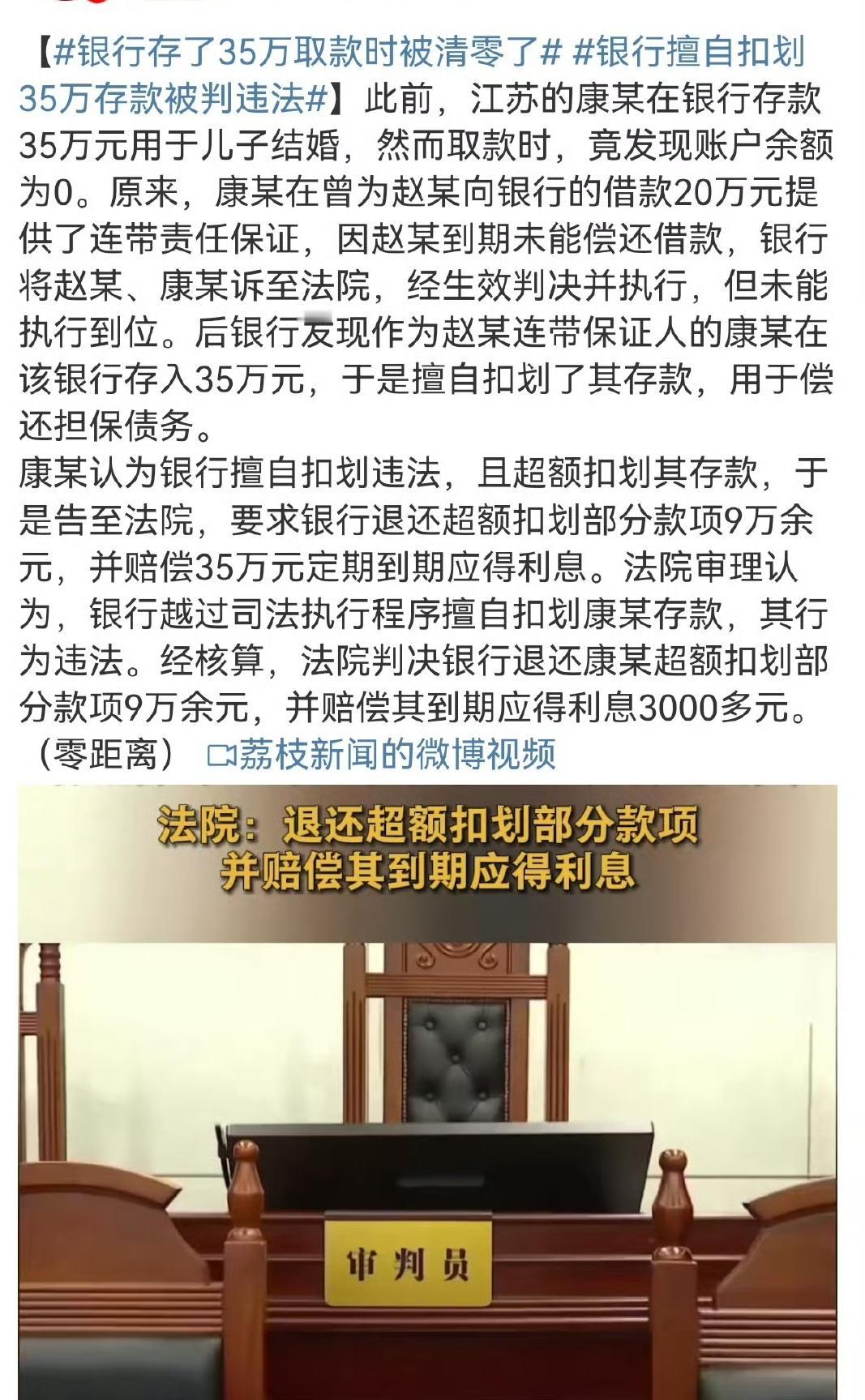太离谱了!存银行的钱说没就没? 江苏如东的康某为儿子结婚存了35万元,取钱时却发现账户余额为0!一查才知道,银行因为他早年给别人做过连带责任担保,就直接把他的存款划扣了,还超额扣了9万多块钱… 康某起诉银行后,法院判了:银行和储户是存款合同关系,银行有义务保障储蓄安全,越过司法程序擅自划扣就是违法!最终判决银行退还康某超额部分9万余元,还要赔偿利息损失3000多元。 律师提醒大家:银行无权私自冻扣储户资金,就算是涉及债务,也得通过法院依法执行。大家遇到存款莫名“消失”,一定要及时维权!另外,给人做担保前可得想清楚,别给自己埋雷哦~欢迎大家评论区留言养老金挪用追责 银行卡乱扣费 银行扣划争议 取款风险 银行扣划存款 银行扣划 存款被划走 强制扣划 信息来源荔枝新闻