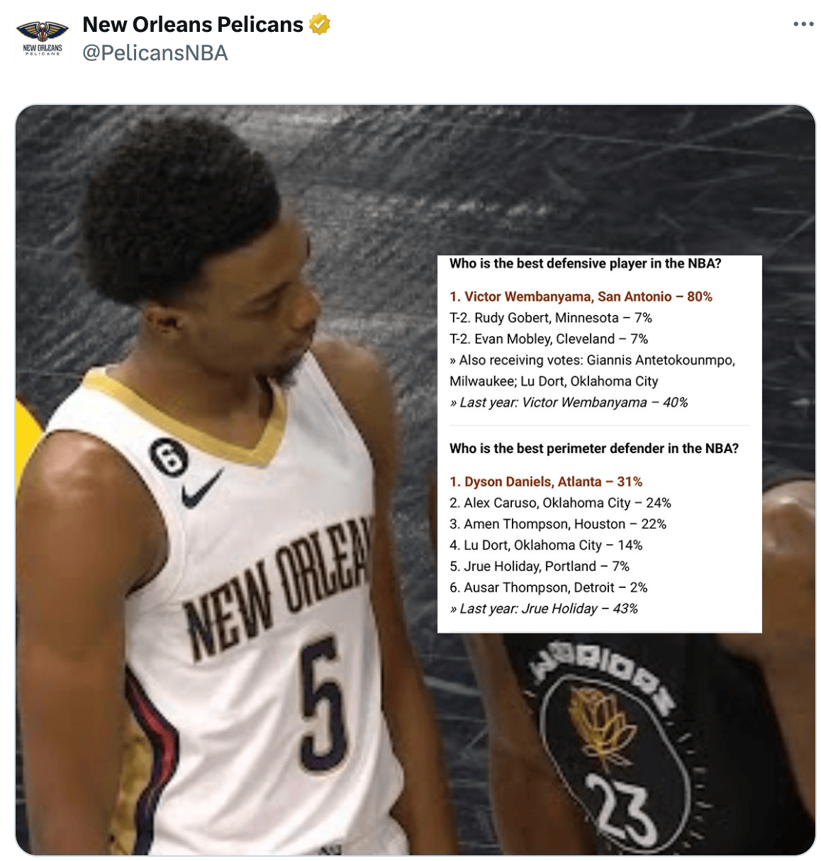 虎扑10月10日讯鹈鹕今日更新官方推特,他们晒图表达了对近期NBA官方公布的联盟球队总经理投票中关于防守球员结果的一些质疑。