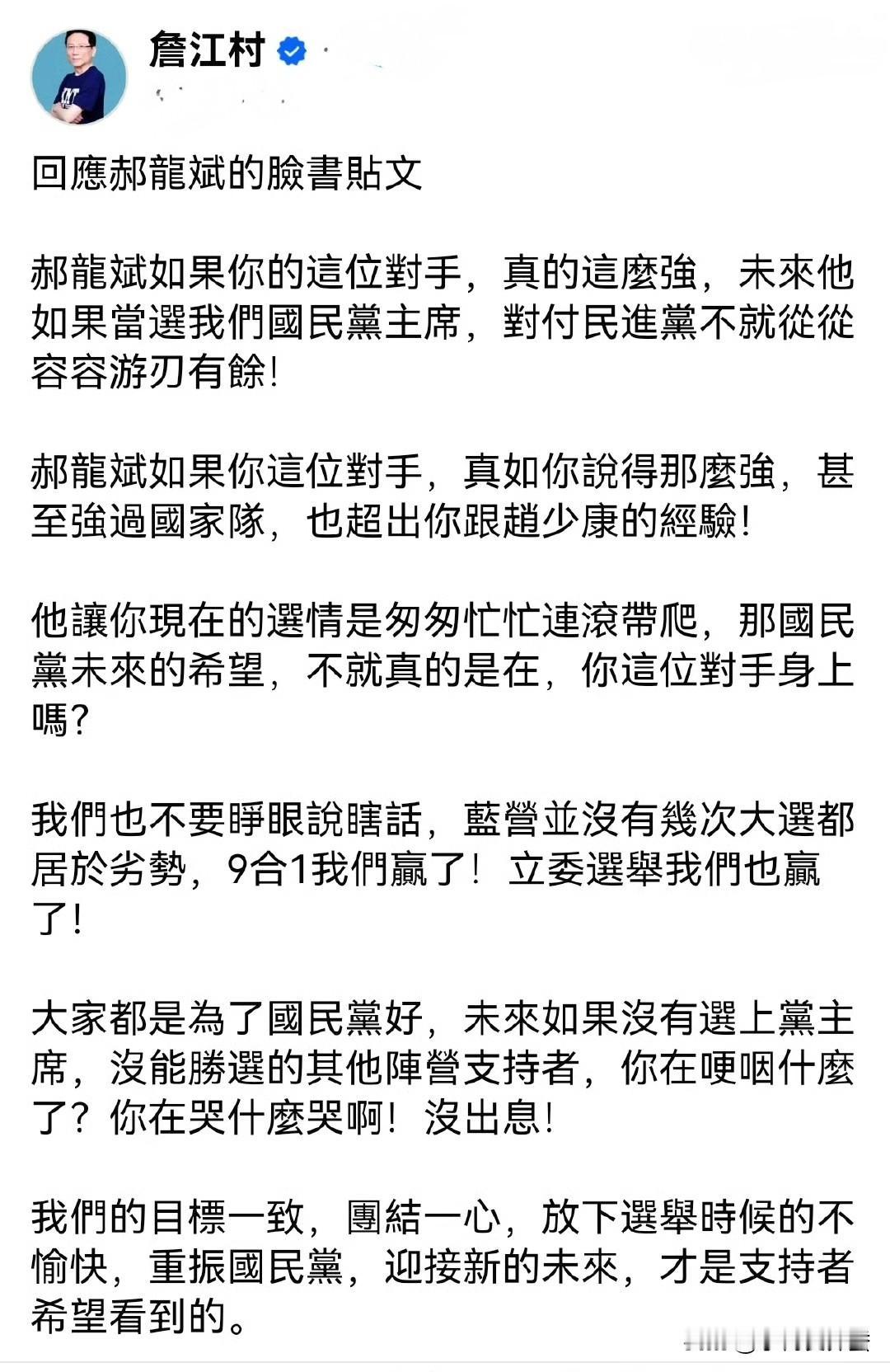 詹江村也被“王世坚”附体了,一篇反驳郝龙斌的贴文,满满的王世坚风,别说,还真戳到了郝龙斌的痛处,看来打败魔法的只有魔法。 郝龙斌给对手候选人发了贴文,大意是他和赵少康在蓝营三四十年,这次竞选中的造谣抹黑手段让他俩开了眼,“假民调、假讯息、铺天盖地强过国家队网军的攻击”,蓝营并没有这么强大的网军,否则之前的几次大选,不会一直处于劣势。 郝龙斌的意思很明显,就是指对手操纵负面舆论。而自己出身好,又特别纯良,错的都是别人,主打一个打不过就甩锅。 这篇贴文,赵少康可能没帮忙把关吧,不然怎么全是坑,让詹江村秀了一把王世坚风。 詹江村的贴文很绝。 对手这么强,就当选好了,对付民进党不就“从从容容游刃有余!” 他把你现在的选情搅的“匆匆忙忙、连滚带爬”,超出你跟赵少康的经验,这样厉害的人不就是国民党的希望吗? “也不要睁眼说瞎话”,蓝营几次大选也不都是处于劣势,9合1赢了,立委选举也赢了! 大家都是为国民党好,就算没有选上党主席,没能胜选的其他阵营支持者,“你在哽咽什么?你在哭什么!没出息!” 只能说都是人才呀,郝龙斌甩锅甩得直白,詹江村怼人怼得精准,蓝营的家务事,戏也太足了。