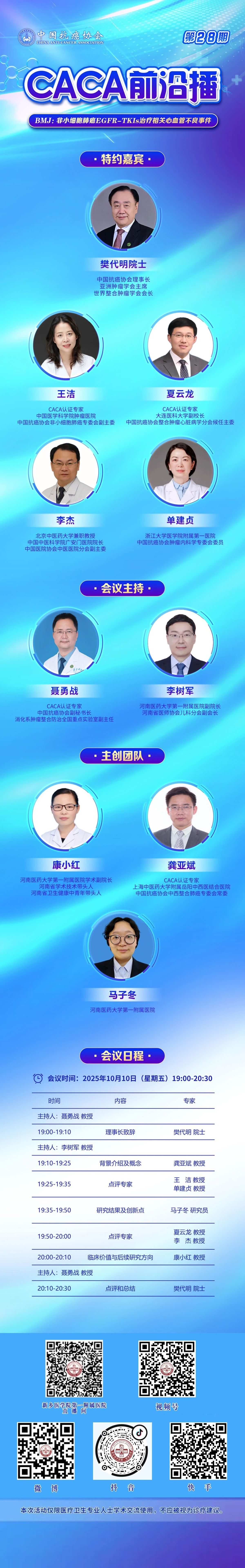 由中国抗癌协会主办的“CACA前沿播(第28期)”,将于10月10日(周五)19:00-20:30在线上举行。届时,主创团队将在直播间分享最新研究成果,为抗癌领域的发展添砖加瓦。