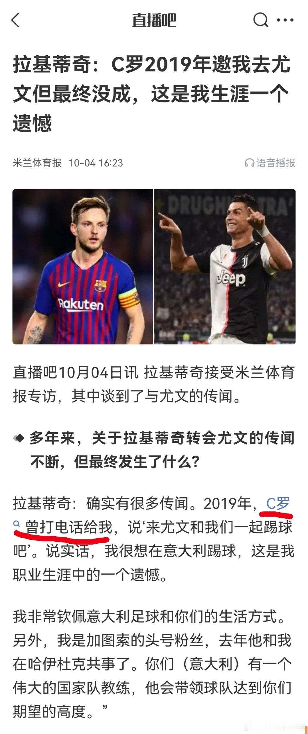 拉基蒂奇:2019年,C罗打电话给我,邀请我加盟尤文图斯。他说:“来和我们一起