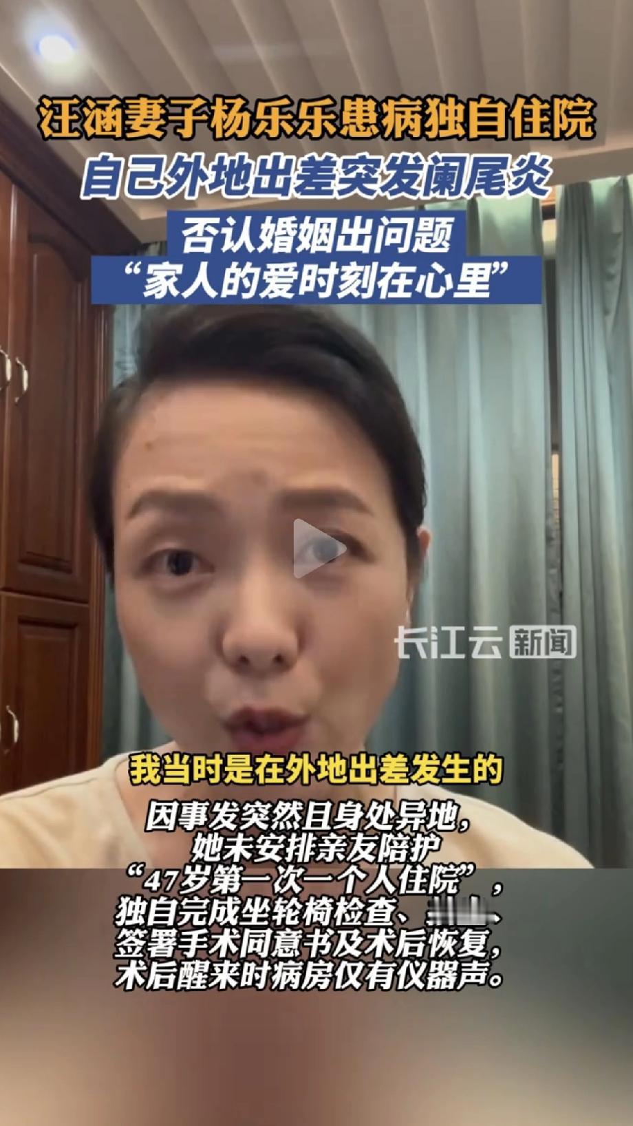 杨乐乐住院后续来了 本人再发视频回应网友了; 人已经没事了,看完我大概总结了有以下几点: 1.她感谢网友的关心和祝福。 2.对网友关心的问提“涵哥去哪了”他再次回应了,说汪涵第一时间知道的并做了安排,账号基本不涉及私人和涵哥,希望更多的人认识她是主持人杨乐乐! 3.重点来了,她希望呼吁和唤起更多40+女性对身体健康的注意,和她一起共同探索过好更好的生活! 说实话我是第一次看她视频,感觉像是一个独立女强人。也不愧是主持人,言简意赅,逻辑思维清晰,希望她能帮助更多的人吧! 最后说下,健康可能真的比金钱重要,希望点赞的评论的收藏的都健康长命百岁哈!