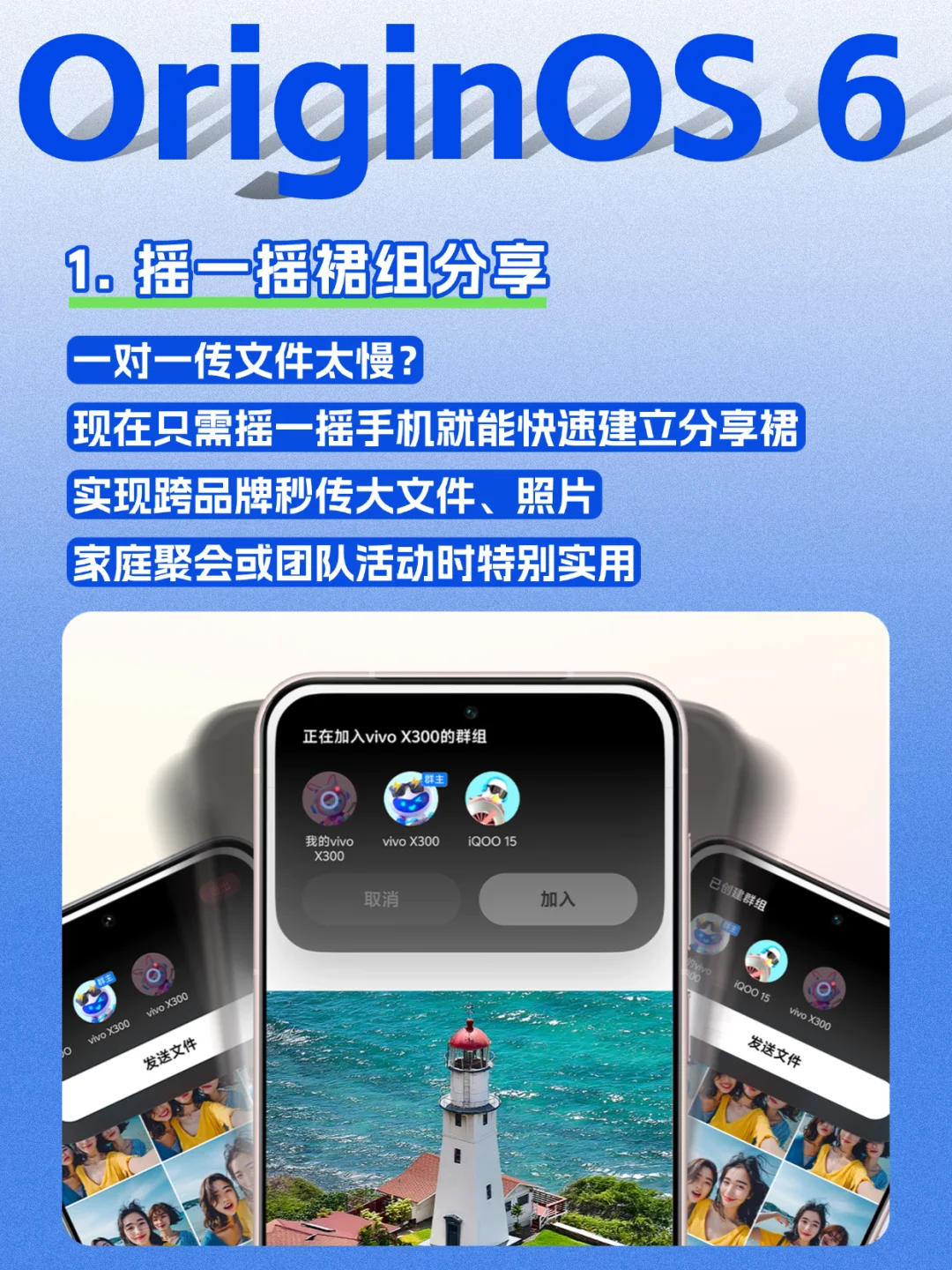 一对一传文件太慢?现在只需摇一摇手机就能快速建立分享裙,实现跨品牌秒传大文件、照片,家庭聚会或团队活动时特别实用。