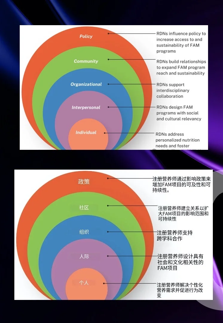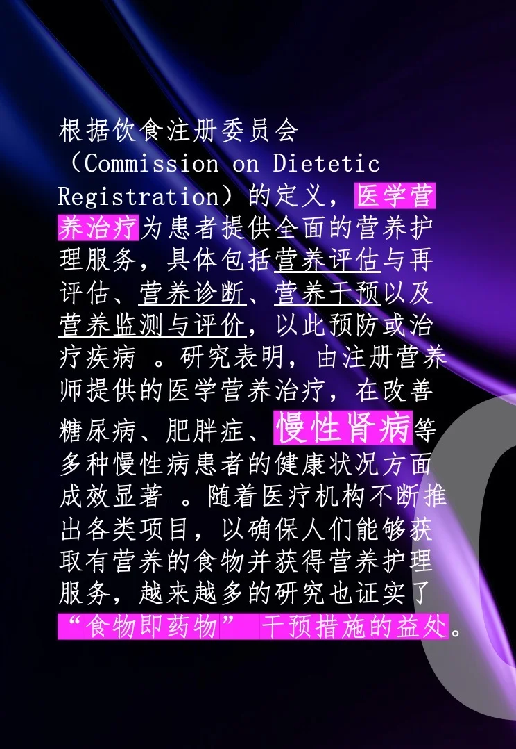 [五R]根据饮食注册委员会的定义,为患者提供全面的营养护理服务,具体包括营养评估与再评估、诊断、干预以及监测与评价。研究表明,由注册营养师提供的e学营养治疗,在改善糖尿病、肥胖症、慢性肾病等多种慢性病患者的健康状况方面成效显著 。