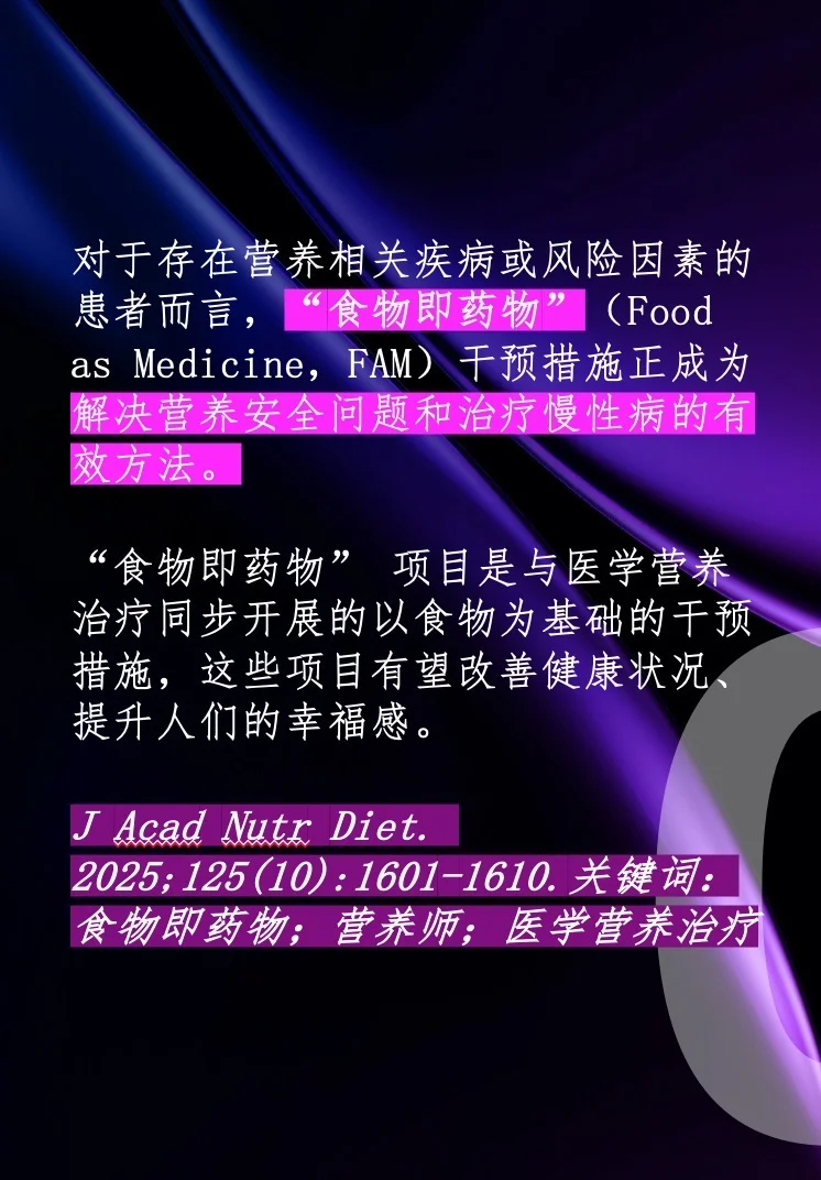 美国营养与饮食学会(Academy of Nutrition and Dietetics,AND)发了一篇重磅文章(J Acad Nutr Diet. 2025;125(10):1601-1610.关键词:食物即💊,营养师;e学营养治疗)详细阐述了 Food as Medicine(“食物即药物” ) 理念和行动。虽然美国的政策、医疗体制和饮食文化与中国截然不同,但