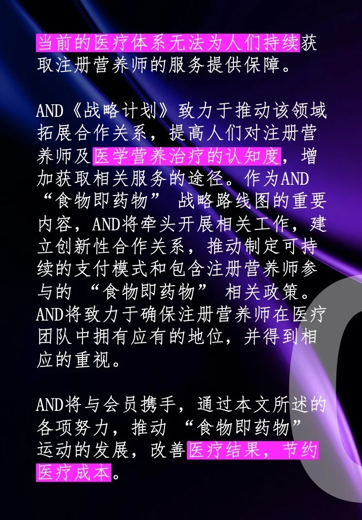 [八R]提高人们对注册营养师及医学营养治疗的认知度,增加获取相关服务的途径。改善饮食习惯和解决系统性障碍